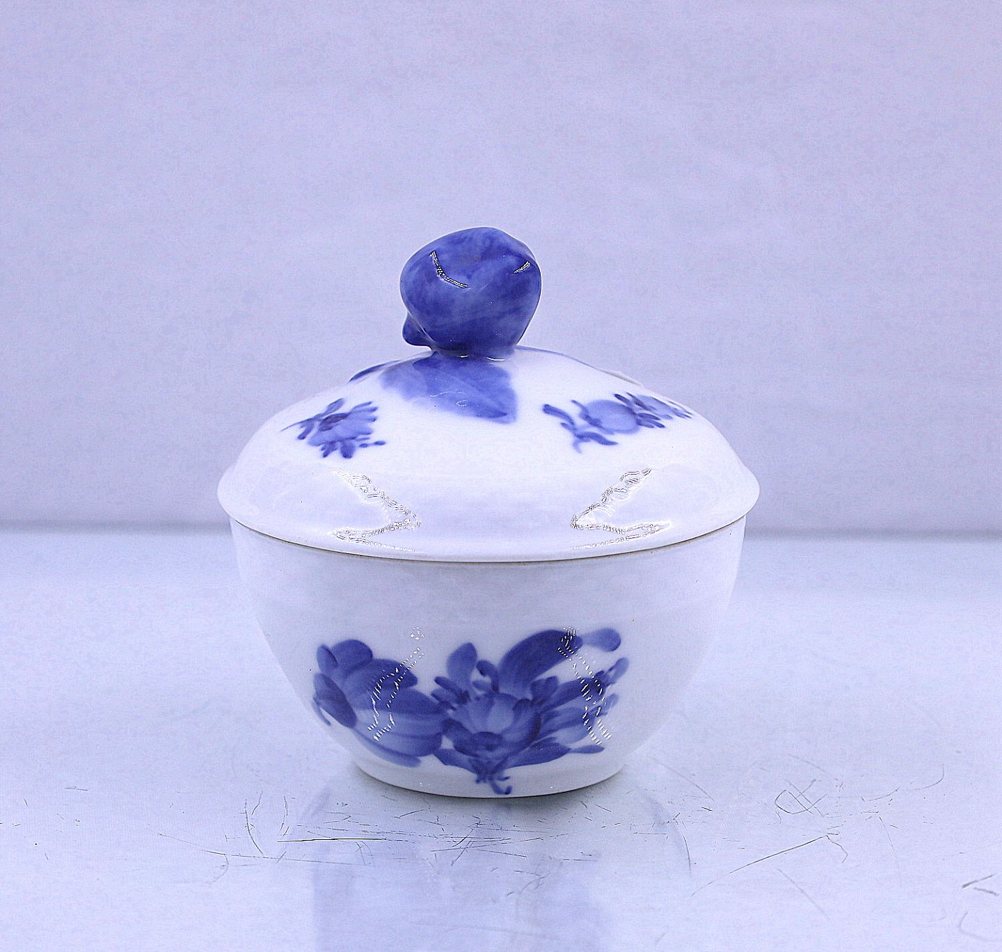 Royal Copenhagen. Sukkerskål, nr. 10/8081, flettet kant. Blå blomst hører til rækken af hvid og blå porcelæn Royal Copenhagen har lavet.