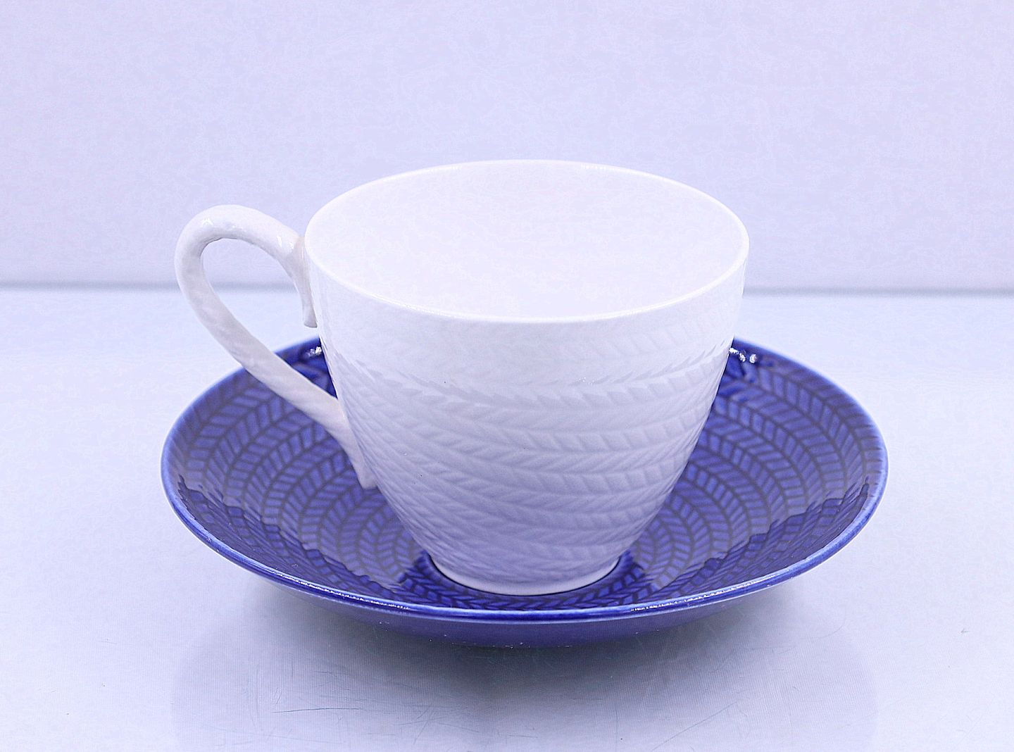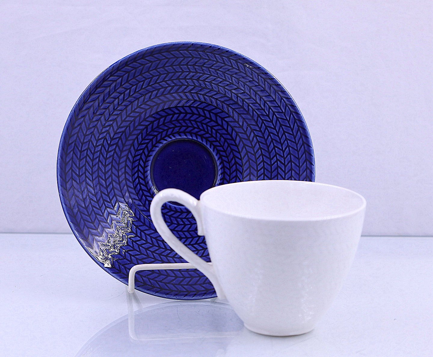 Blå Eld, Rørstrand. Hvid kop + blå underkop. Sættet er fremstillet i blå fajance med indstøbt sildebensmønster.