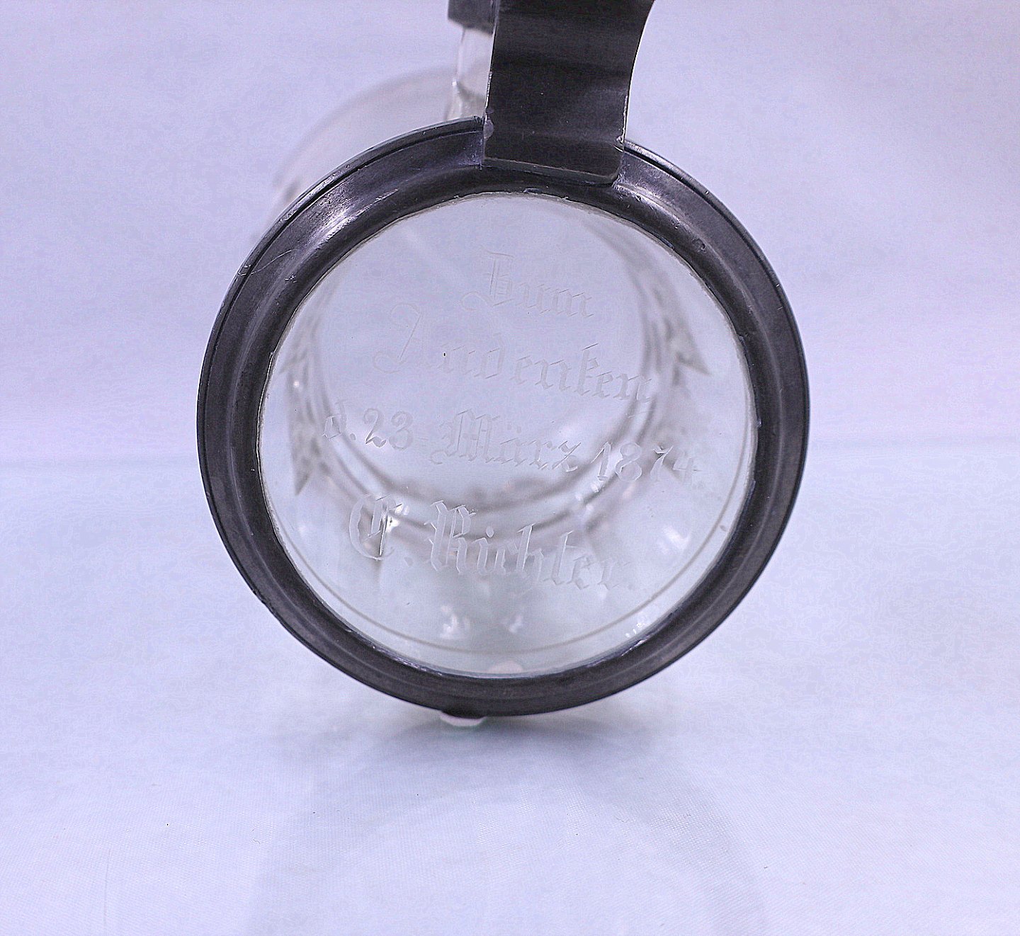 Glas med tinkanter og vippelåg. På låget er der, med gotisk skrift, graveret navn og dato, Anna Andersen, 23 märtz, 1874.
