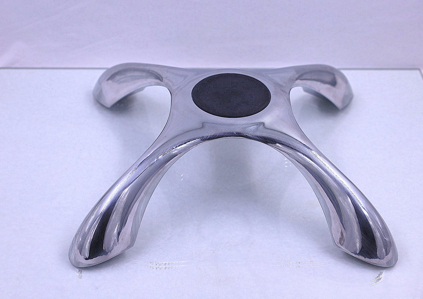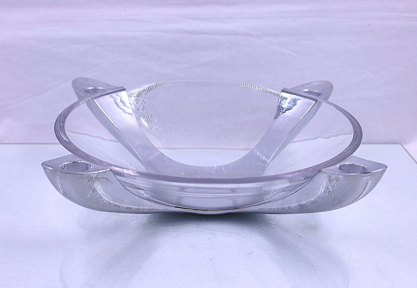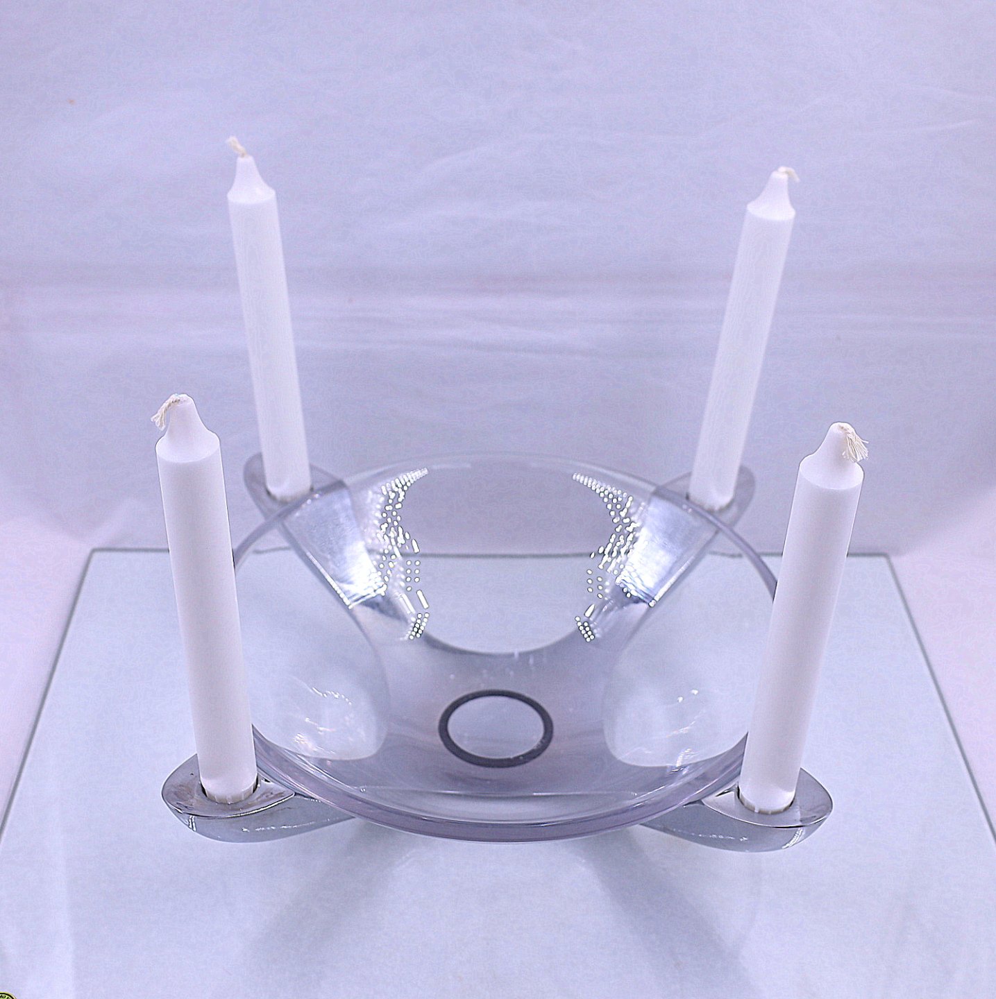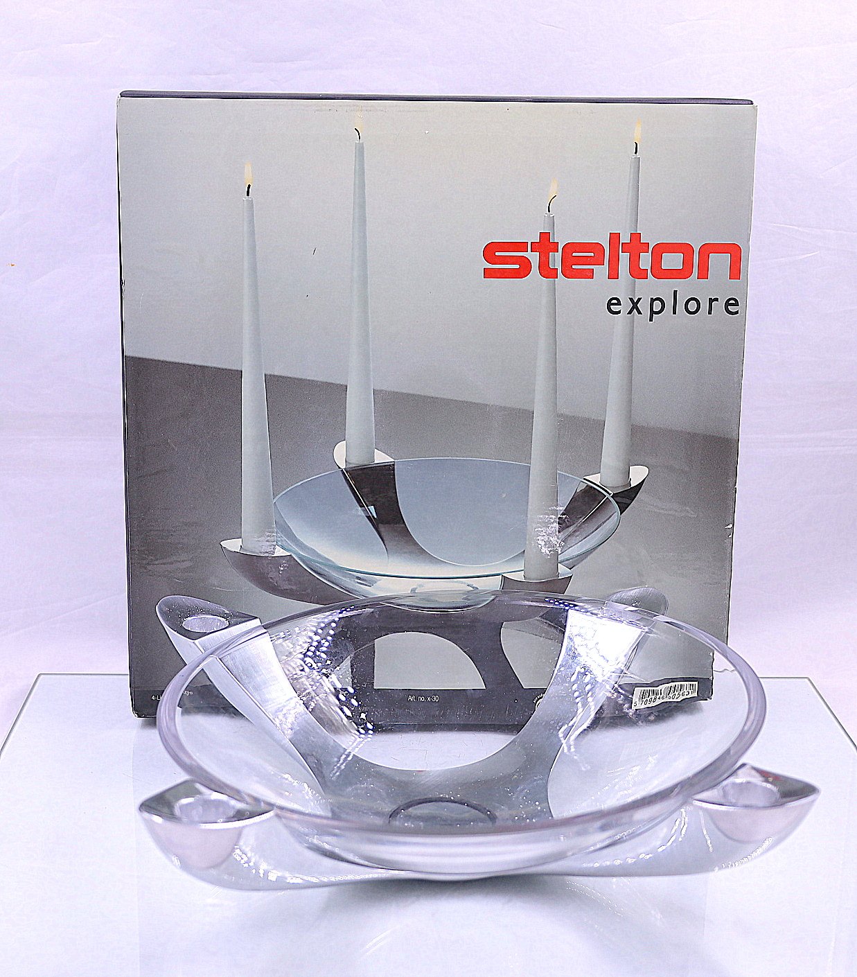 Stelton Explore " 4 lights". Rustfrit stål lysestage til 4 stearinlys, med glasskål lavet af Holmegaard Glasværk. Centrum, bagpå, er dækket med en gummipude.