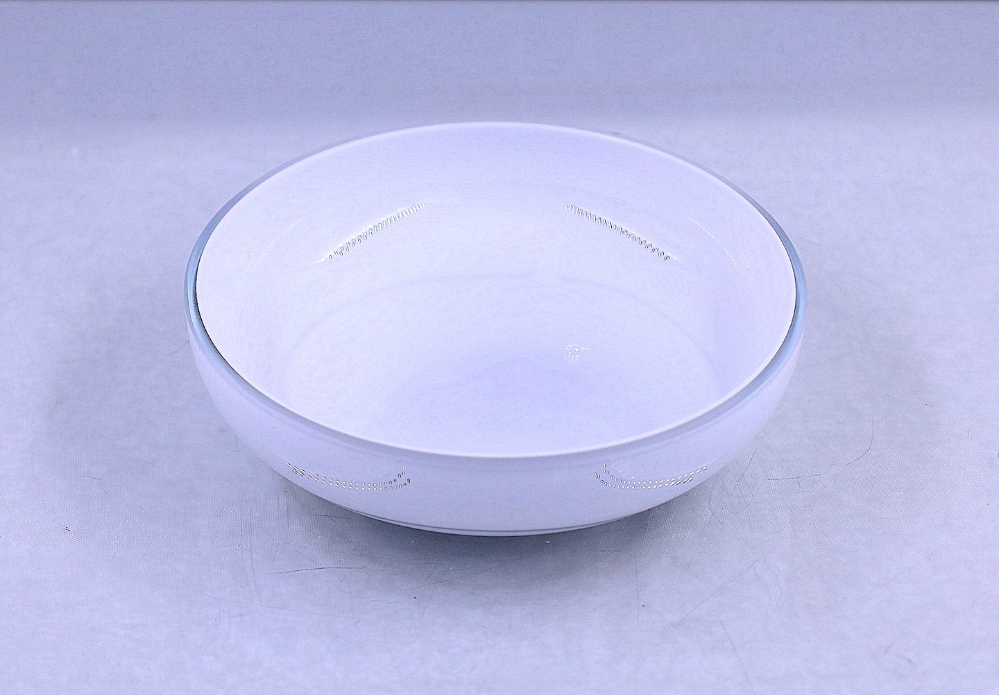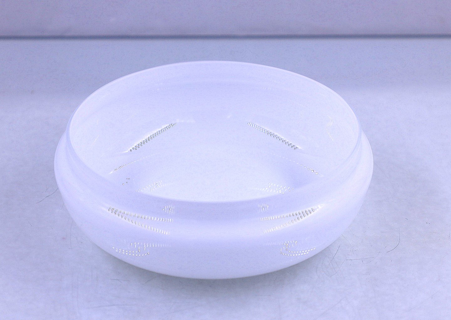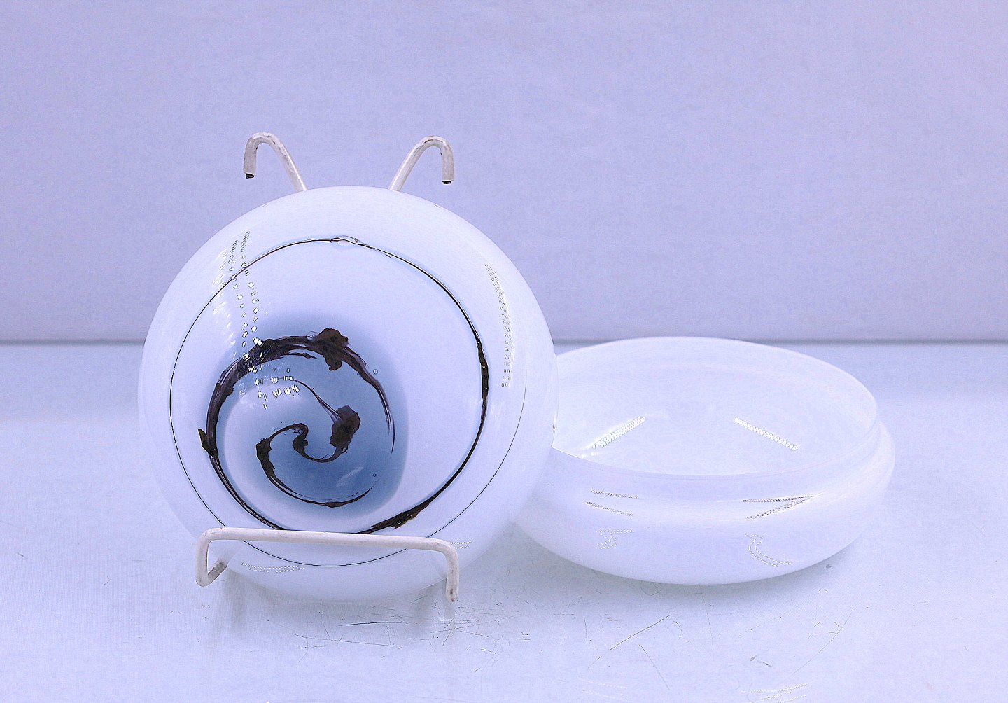 Farver i blåt, lagt på det varme opalglas klart glas som overfang. Bonbonnieren er blæst i 3 lag.
