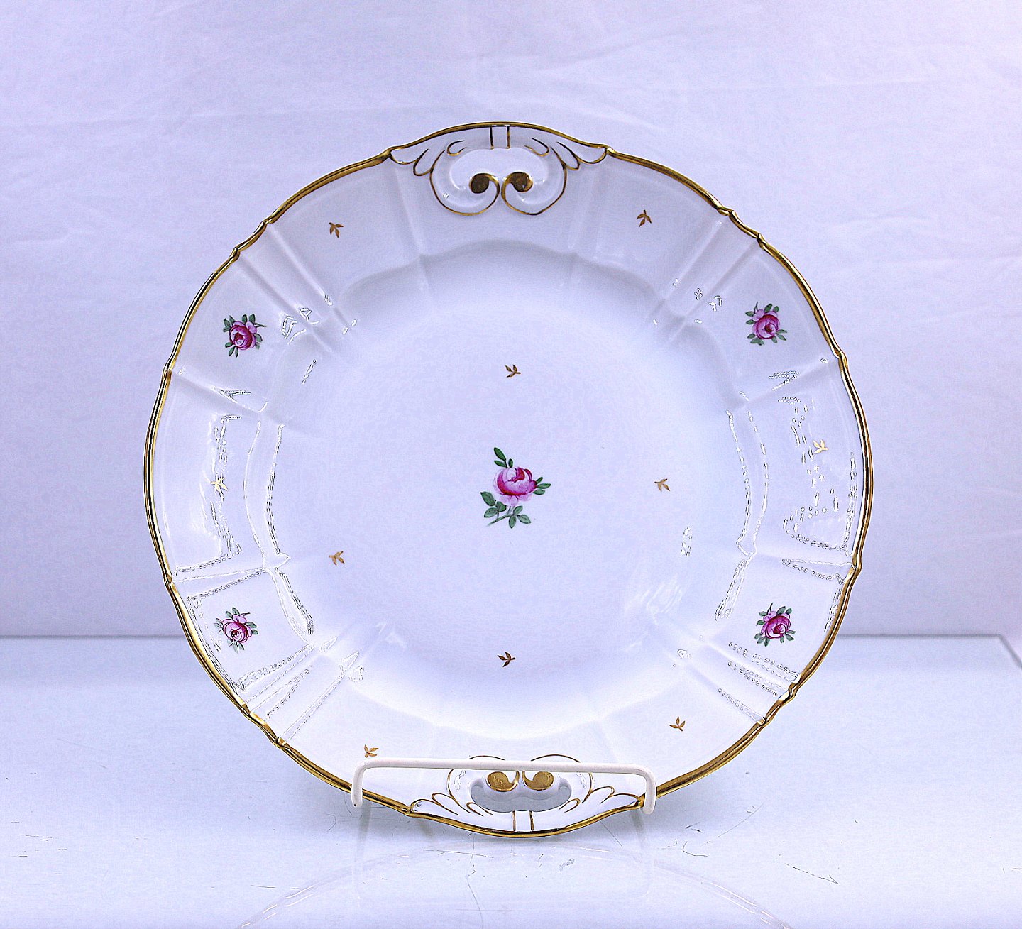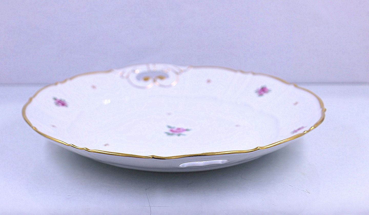 Fadet er med 2 hanke og fremstår i hvidt kantet porcelæn med bred guldkant og strøblomster.