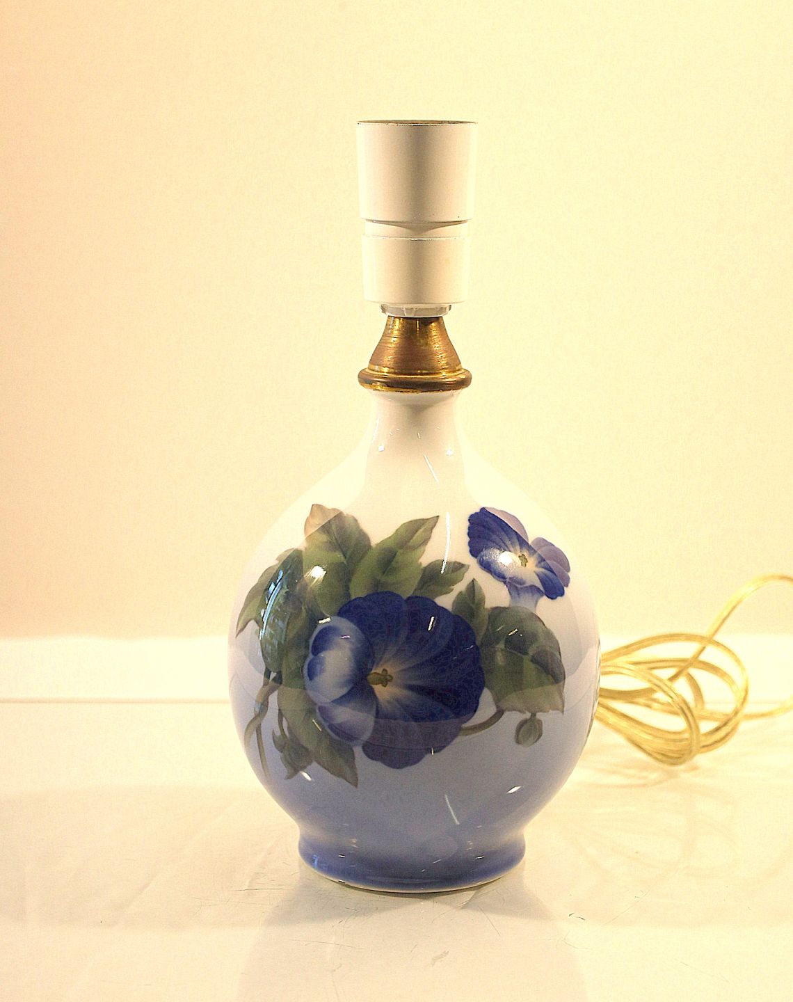 Lampefoden i hvid porcelæn med gradueret blåtonet bund dekoreret med blå pragtsnerle og grønne blade.