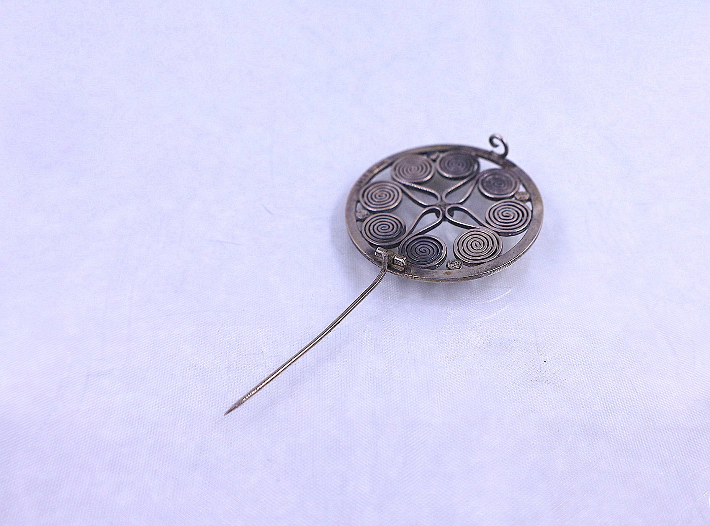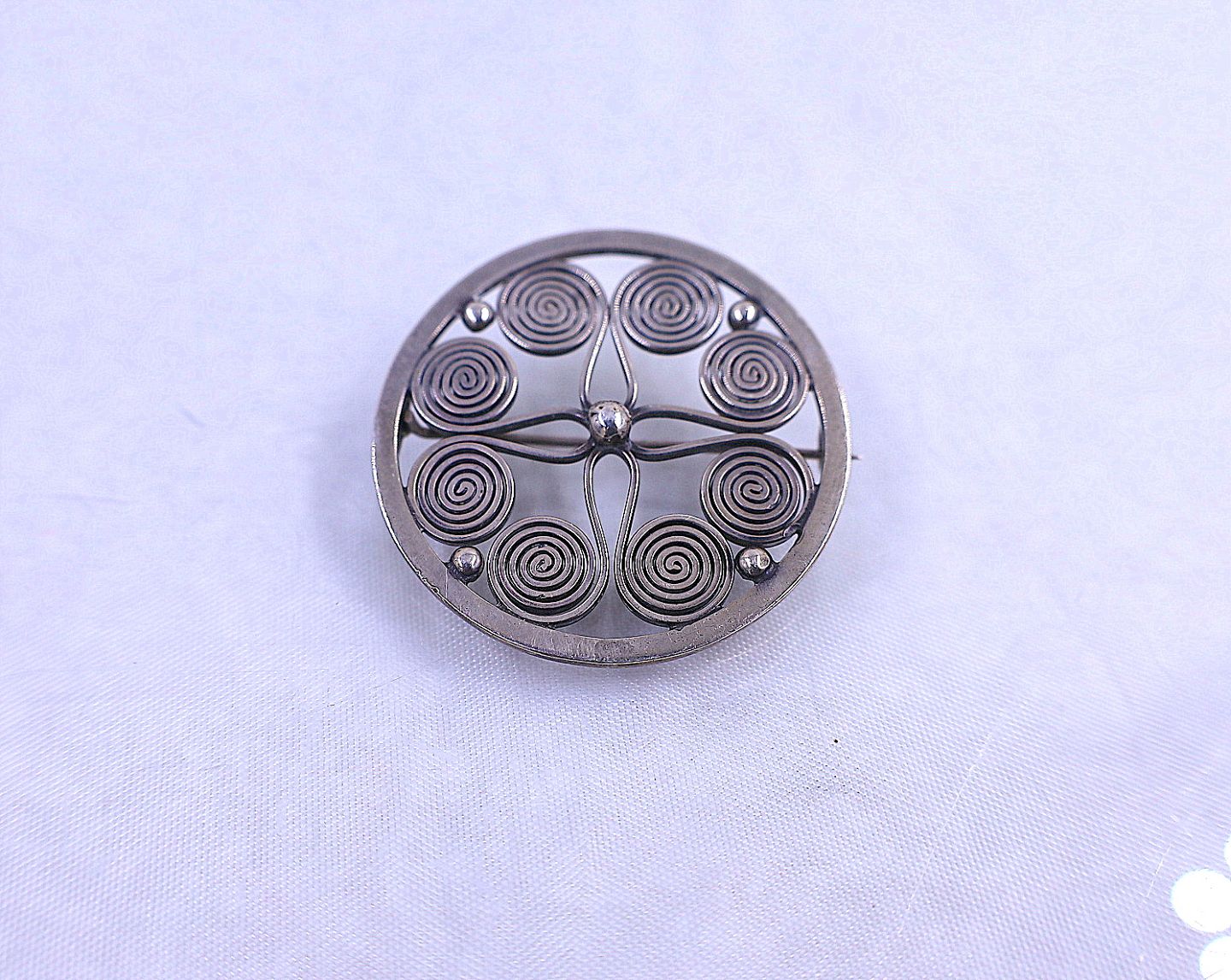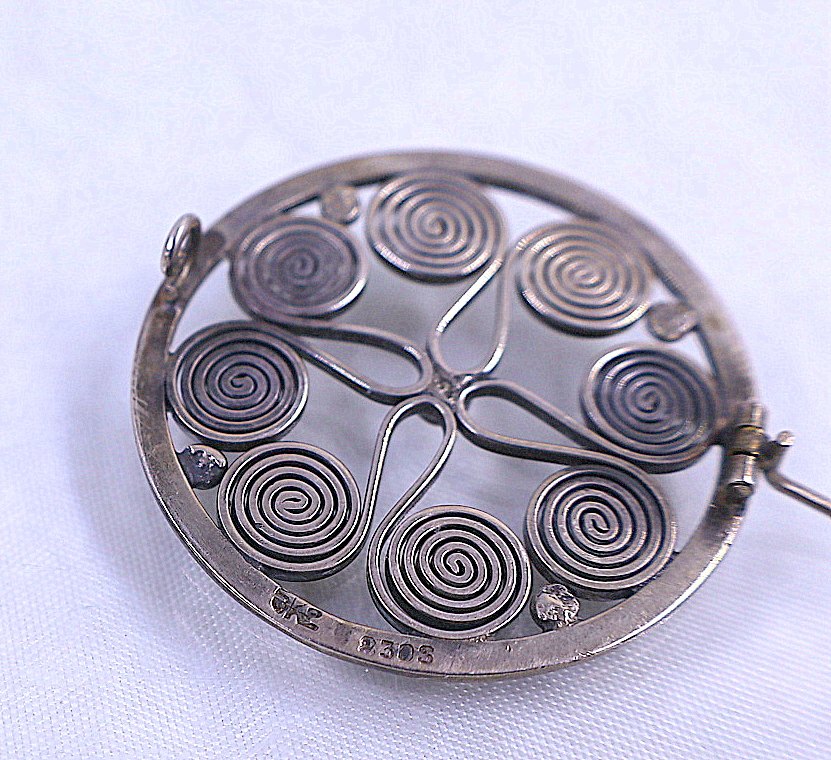 Broche, der ligner en vikinge mønt. Brochen er stemplet med initiale, som jeg ikke kan læse, og 830s.