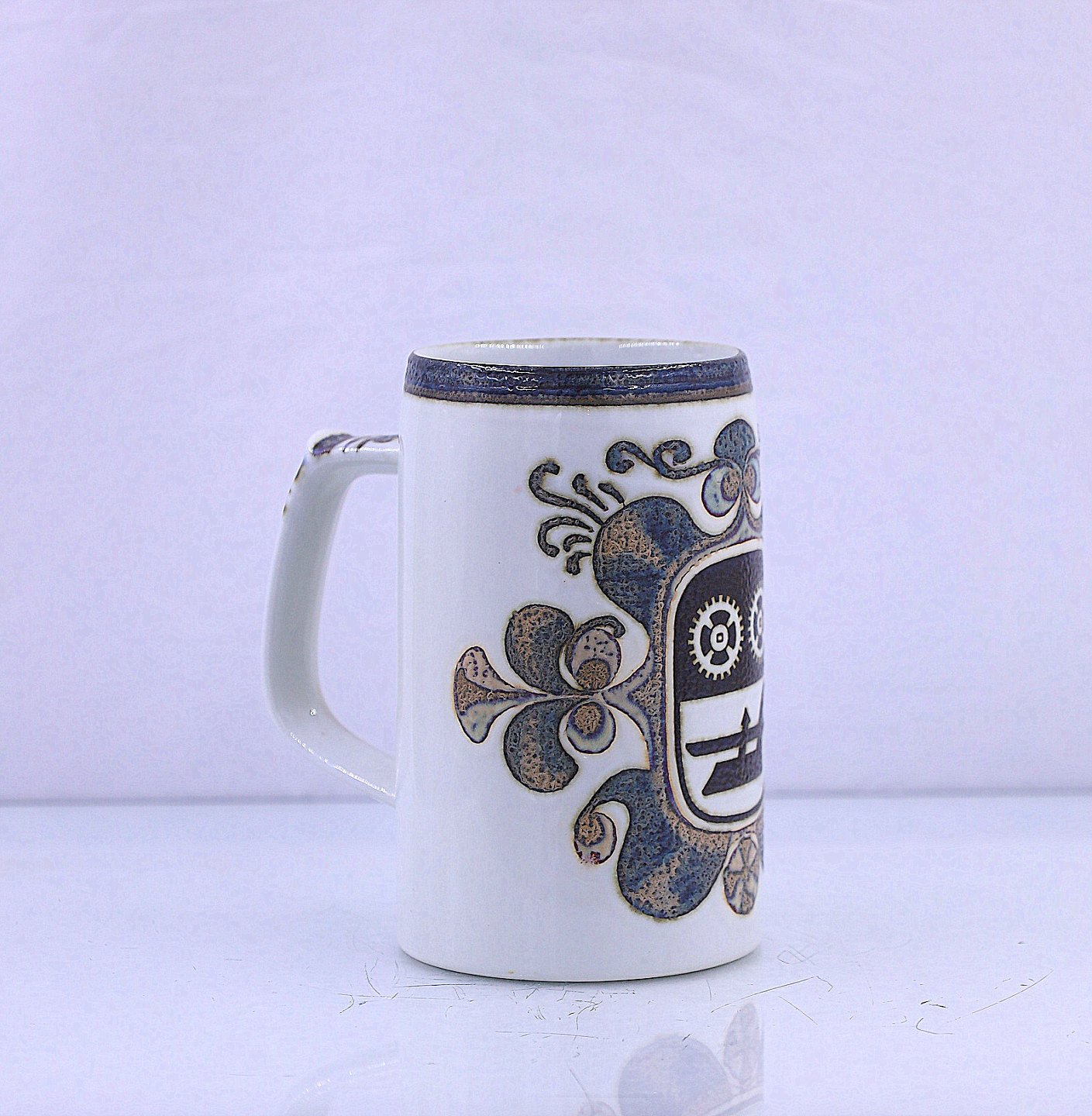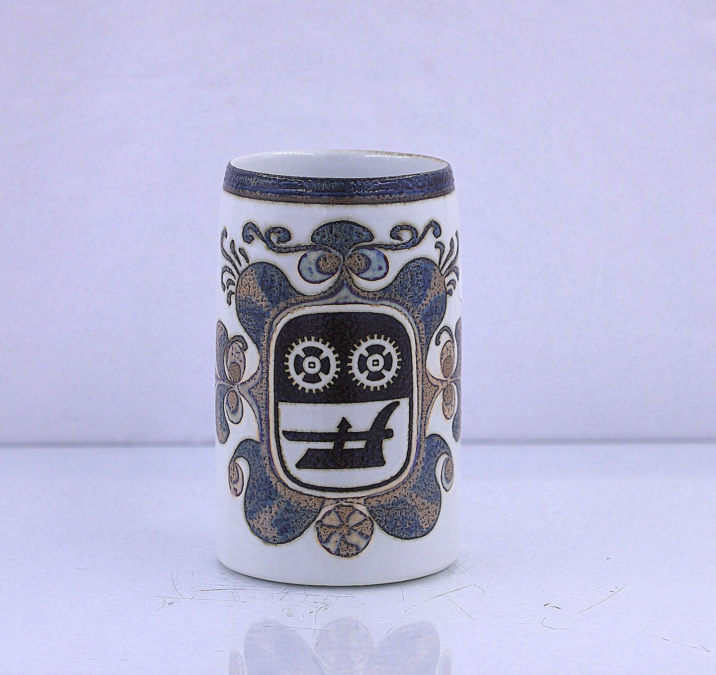 Royal Copenhagen Krus med hank. kruset er dekoreret med Brønderslevs kommunes våbenskjold. Våbenskjoldet forestiller 2 tandhjul og en plov.