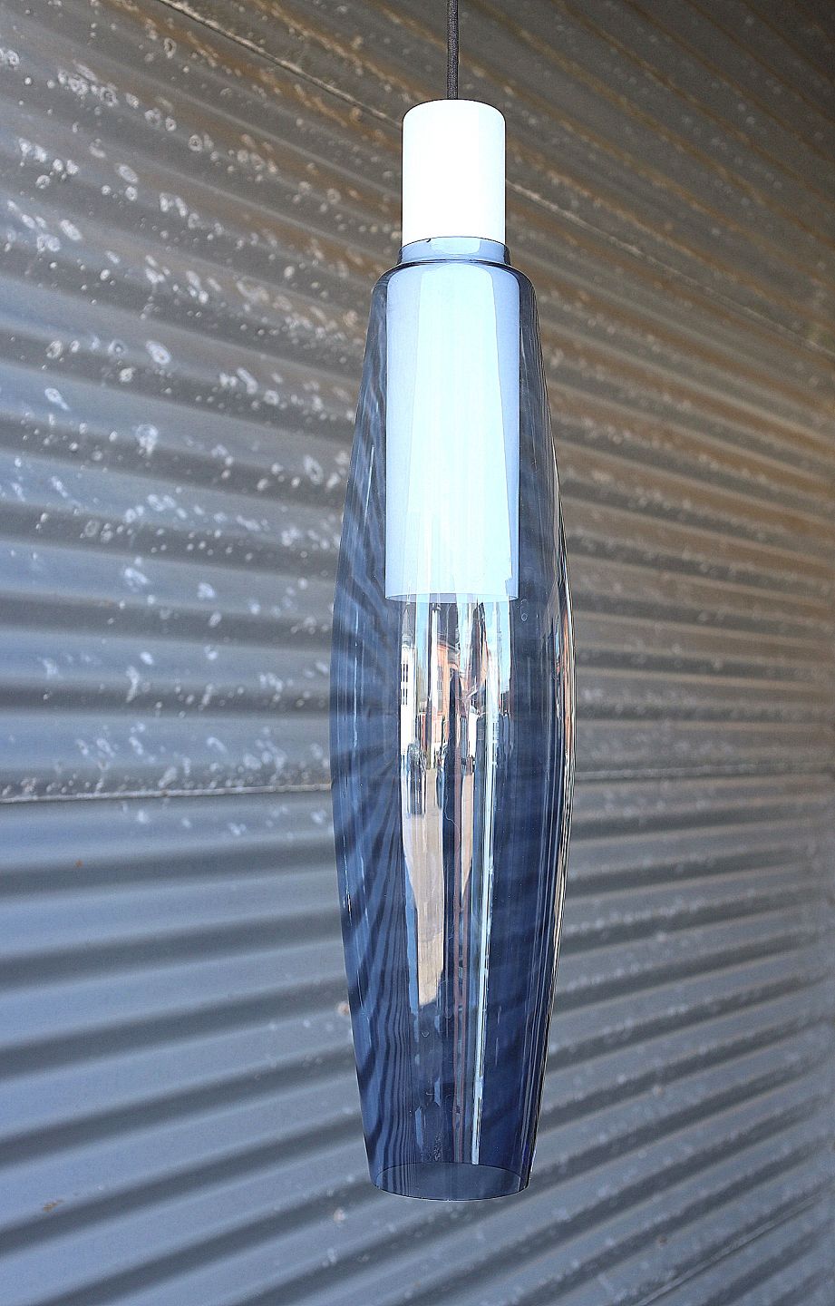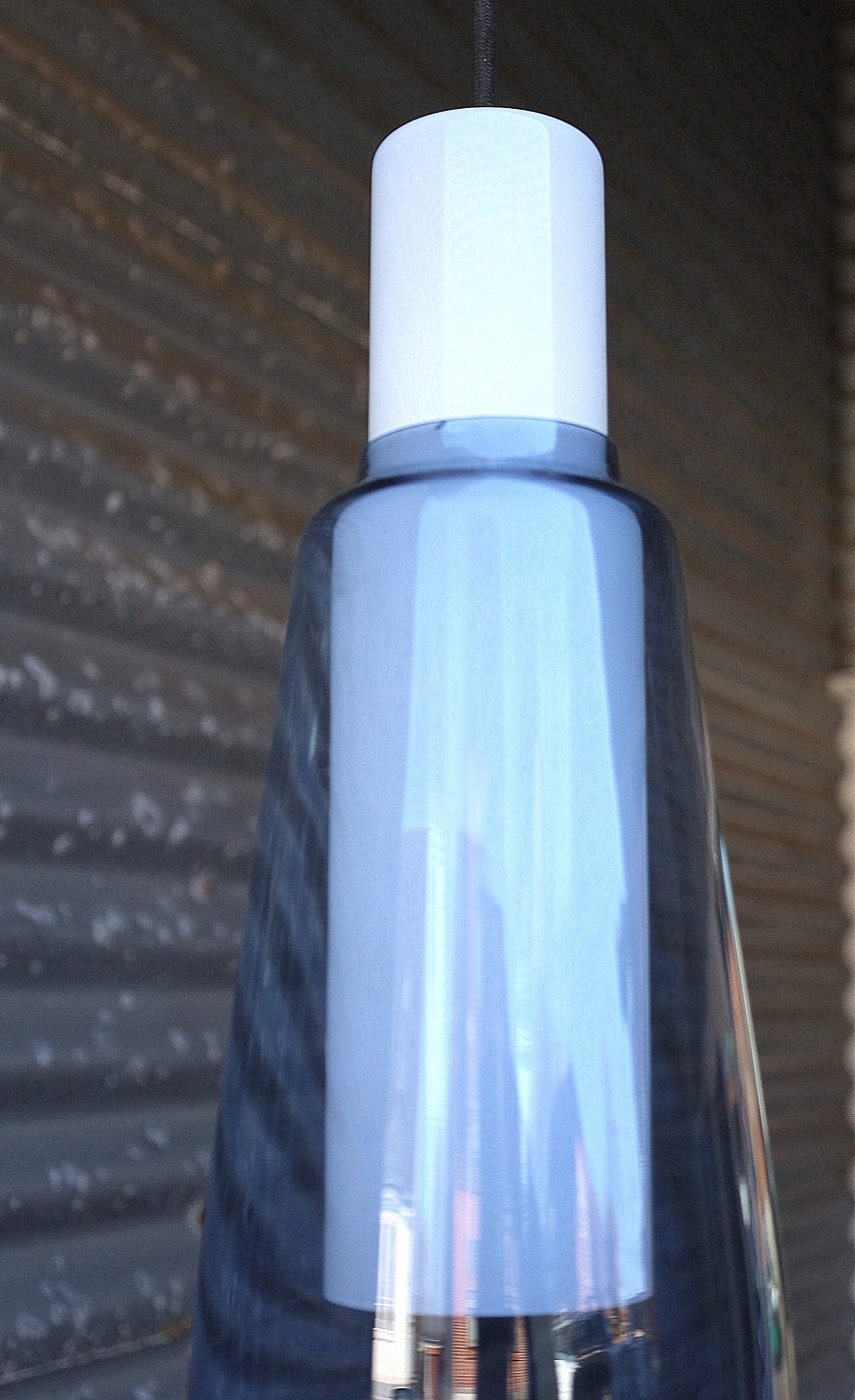 Høj glas pendel, med opal glas og transparent blåt yderglas.