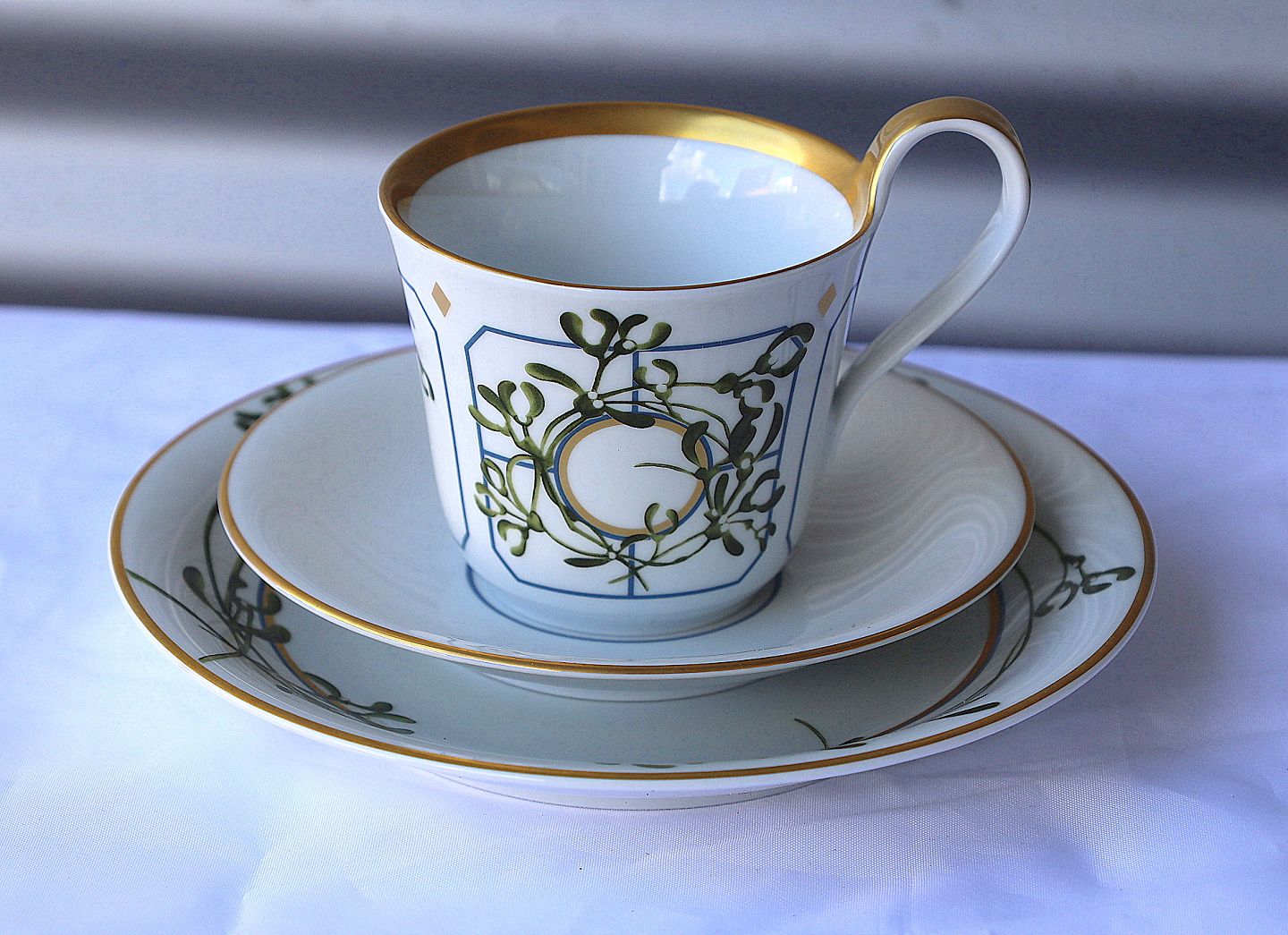 Royal Copenhagen. Julestel med dekoration af mistelten. Sættet består af kop med høj hank, nr. 2505093, underkop, nr. 2505094, sidetallerken, nr. 2505617.