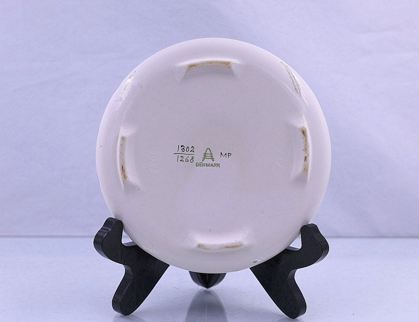 Skålen er dekoreret med stiliseret frugter, pærer og blommer. Kanterne er bøjet indad, og dekoreret med blå og brune bølger.
