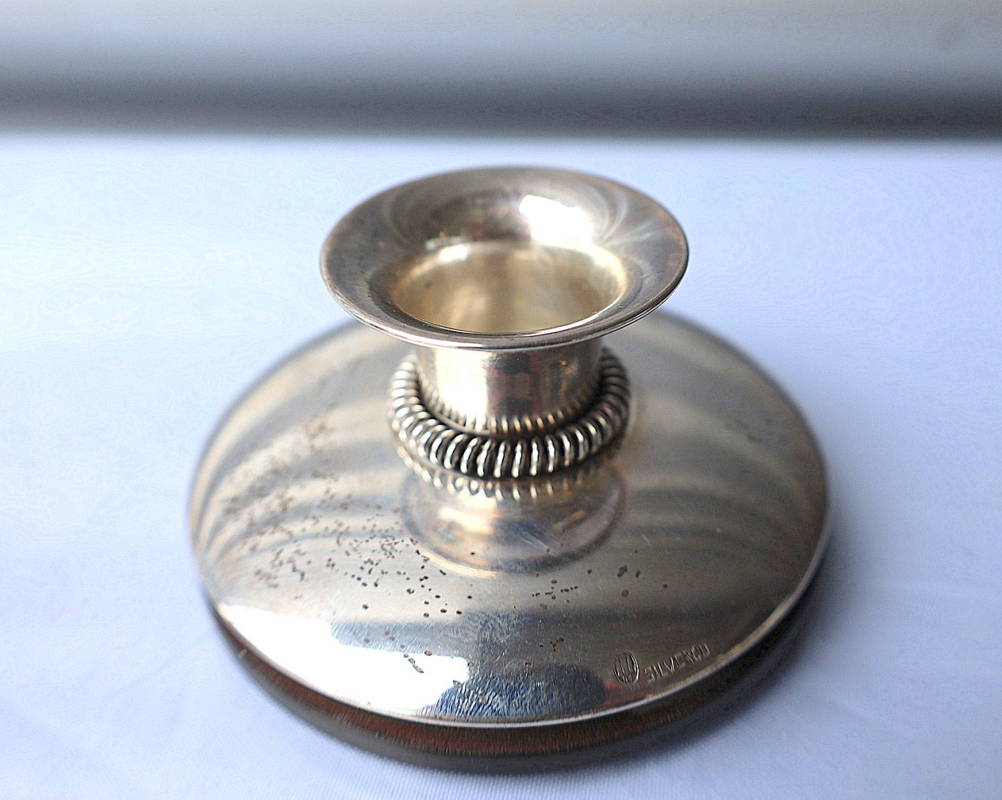 Lysestager stemplet "Silverco". "Silverco" lysestager 3-tårnet sølv, fra 1954. Lysestagerne er pyntet med en spiral. Bunden på stagerne er lavet af plastlignende materiale.