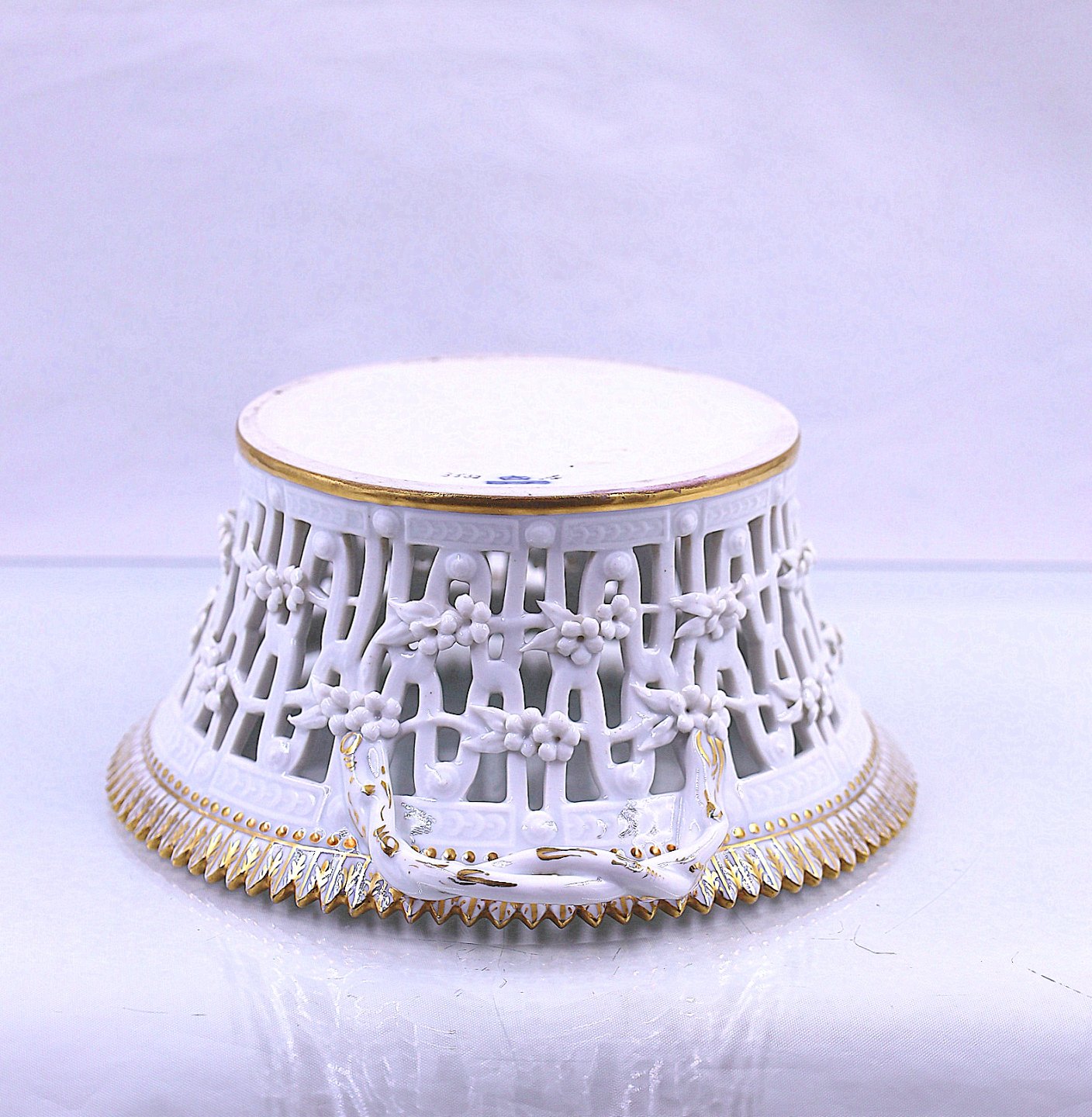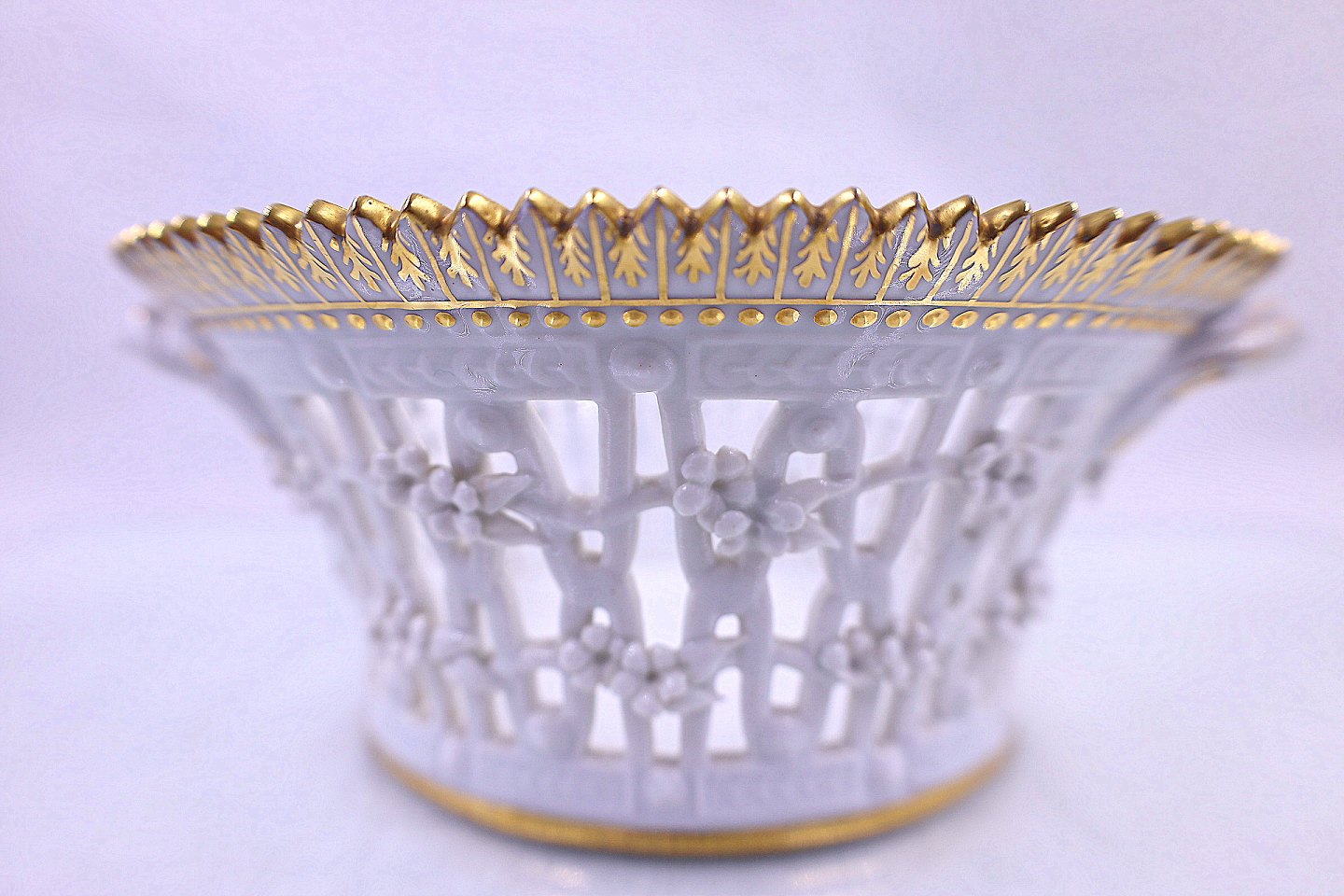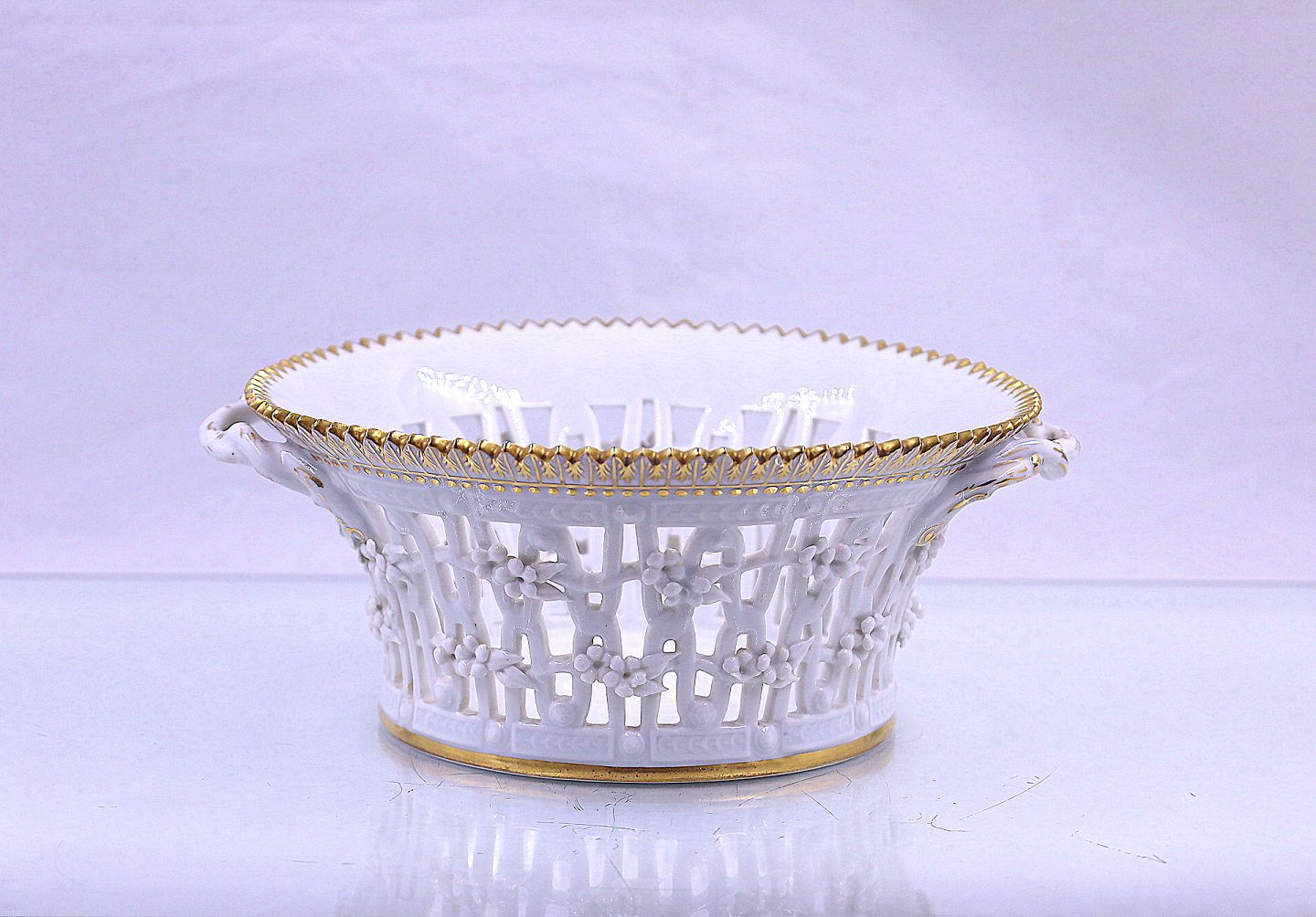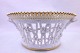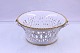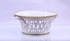 Royal Copenhagen. Flora Danica, nr. 3532. Skålen er hvid med guldkant. Frugtskål med gennembrudt kant. Blåbær blomster som dekor.