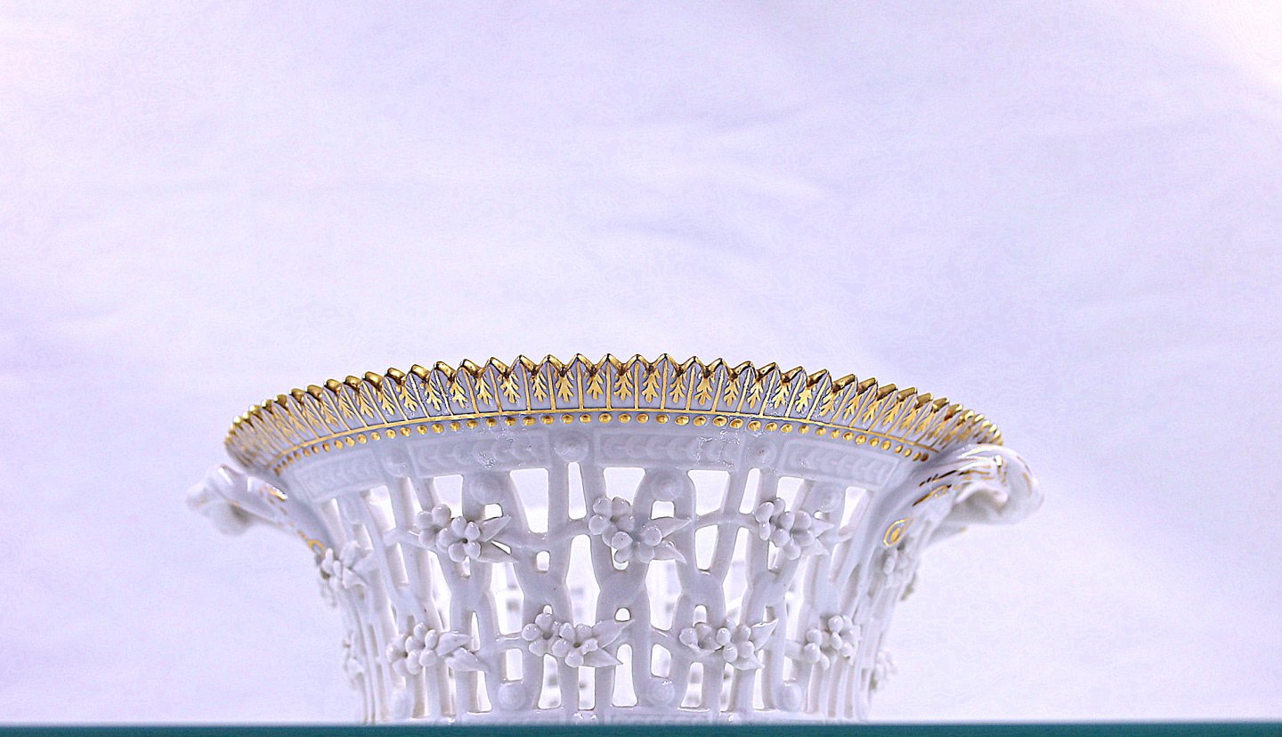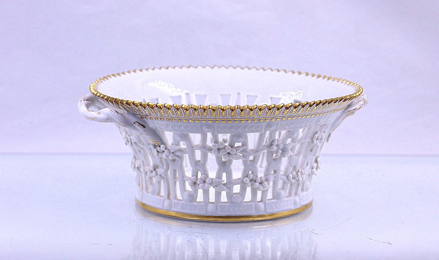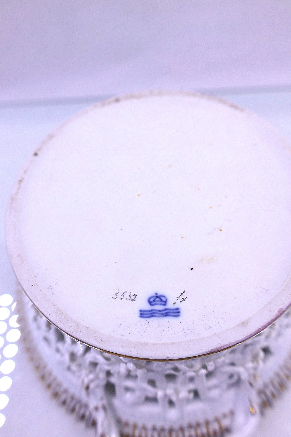 Royal Copenhagen. Flora Danica, nr. 3532. Skålen er hvid med guldkant. Frugtskål med gennembrudt kant. Blåbær blomster som dekor.