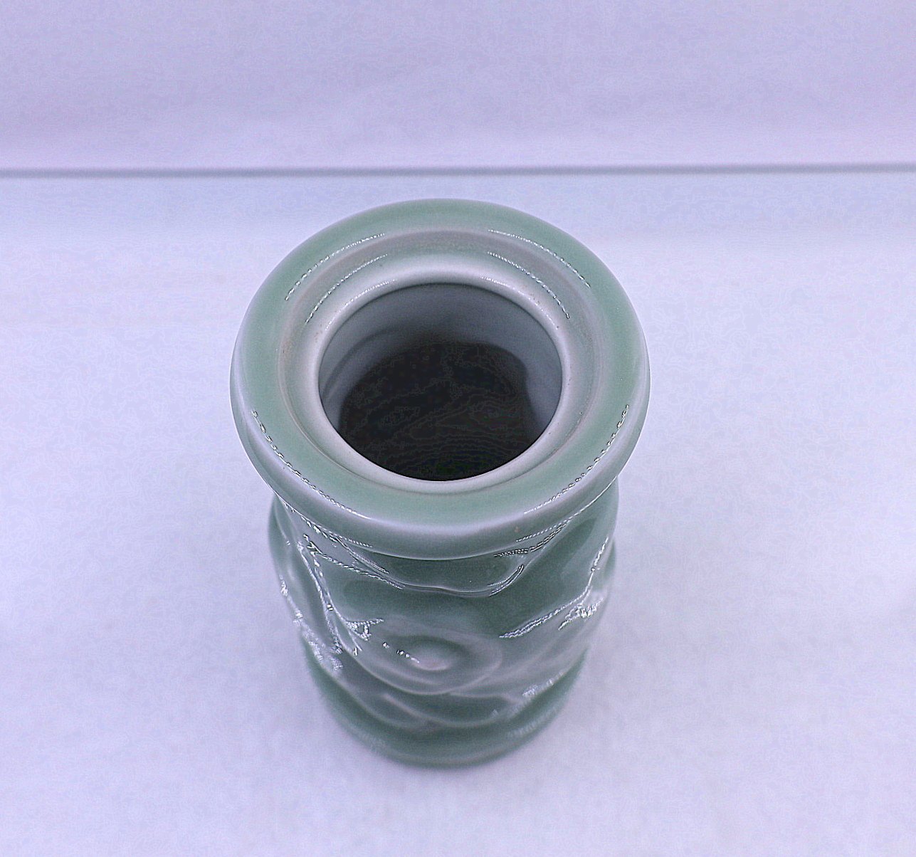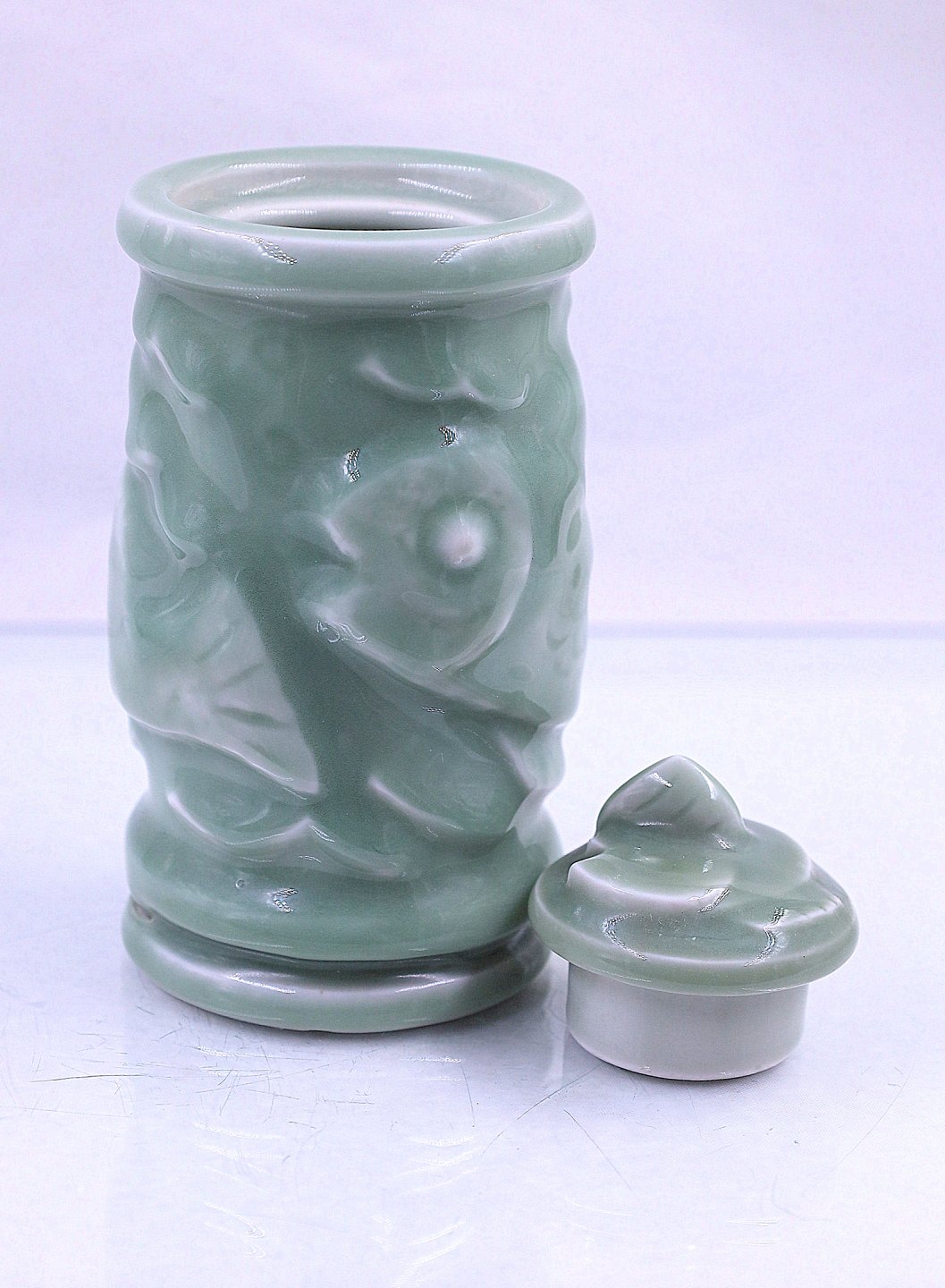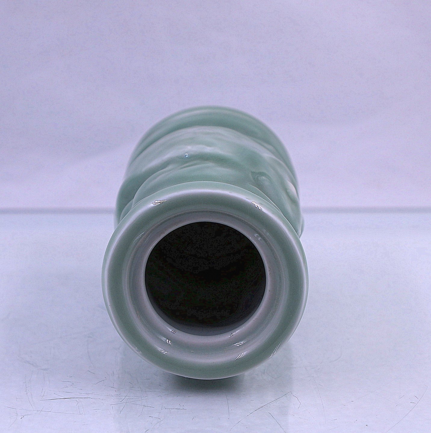 Royal Copenhagen. Jais Nielsen, låg vase. Vasen er dekoreret med fisk og grøn celadon glasur.
