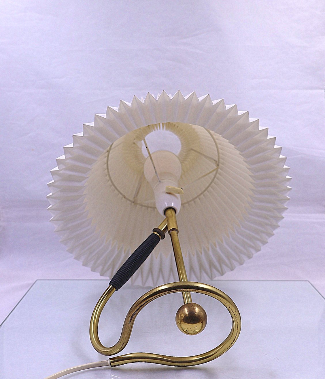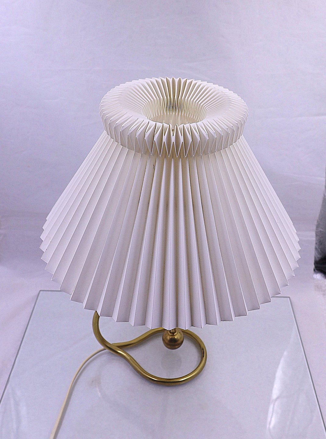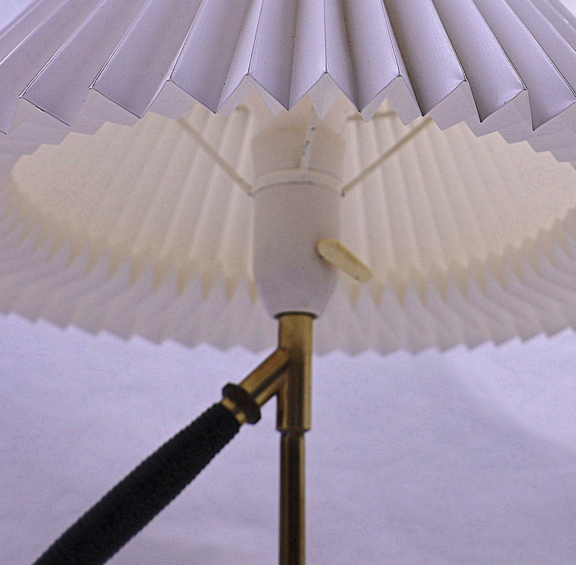 Le Klint lampe, model 306. Lampen er kipbar og kan derfor bruges som både bordlampe og væglampe. Lampen er af messing, med håndfoldet, plast, plisseret skærm.