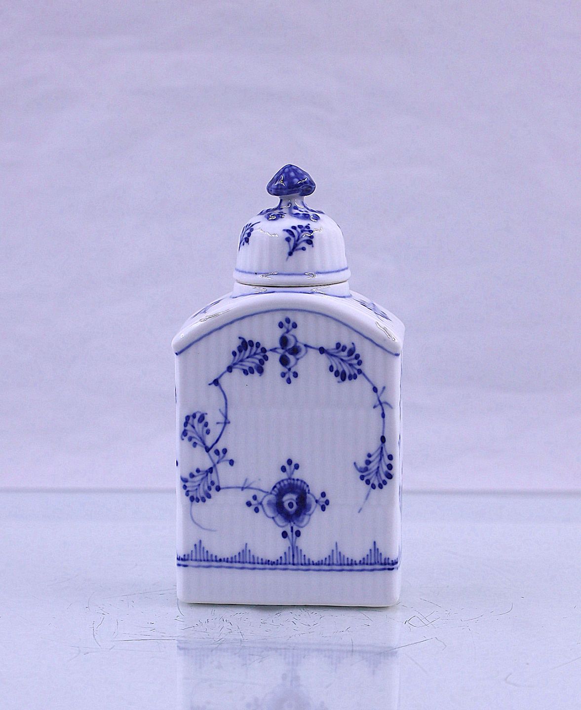 Royal Copenhagen. Musselmalet riflet te dåse, hr. 1/261. Te dåsen er med porcelæns prop, blev også lavet med korkprop og sølv montering.