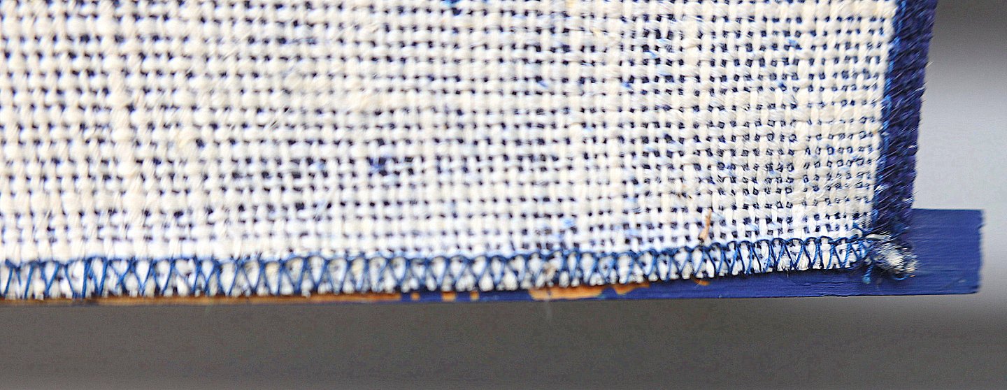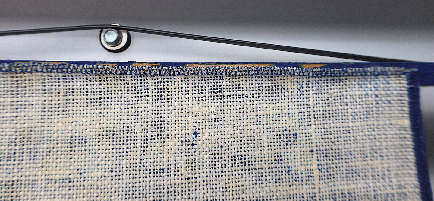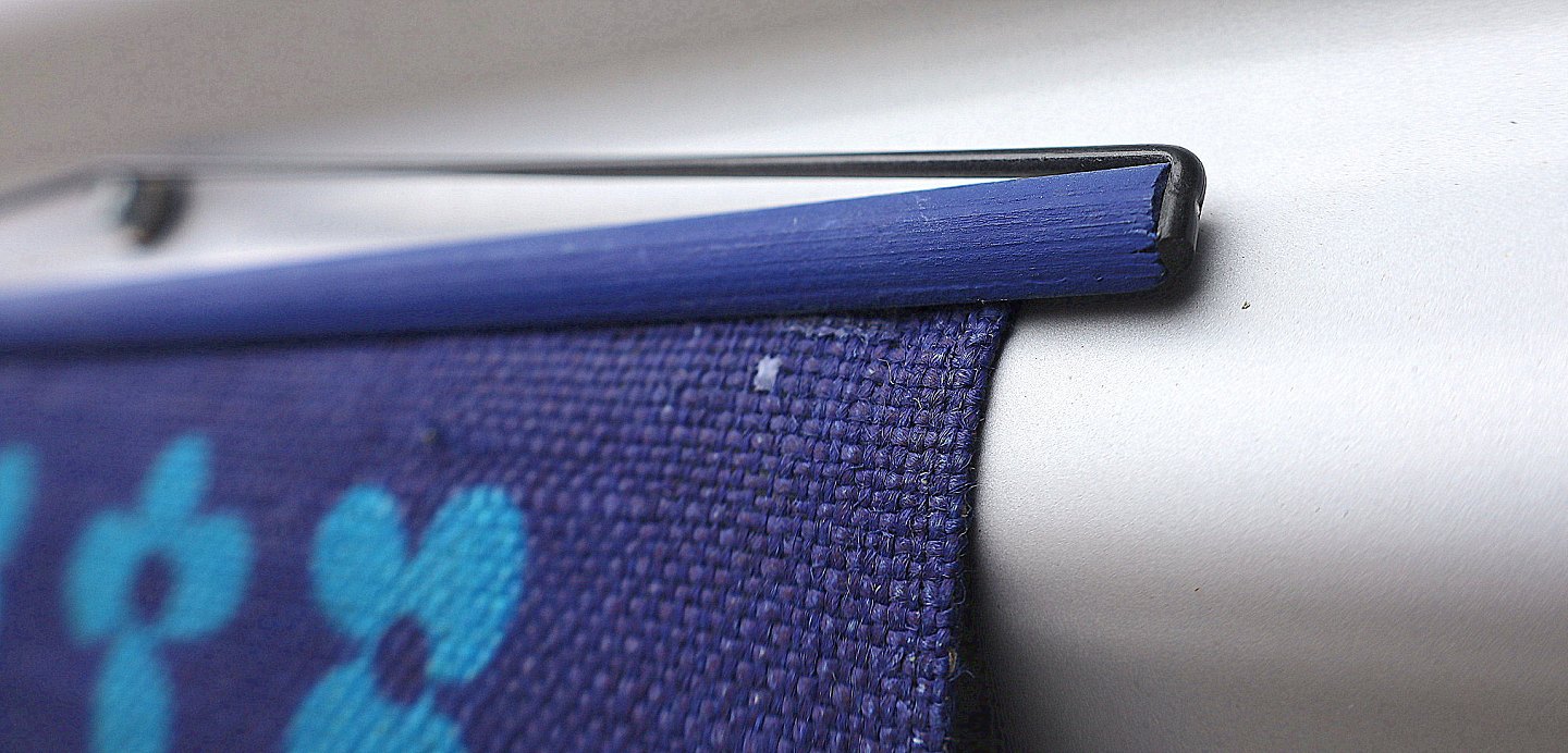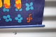 Væg ophæng, blåt ophæng med lyse blomster og gul giraf med orange blomster. Ophæng trykt på sækkelærred, syet, med siksak sting, på ophængspinde, gummiophænget er sømmet på pinden.