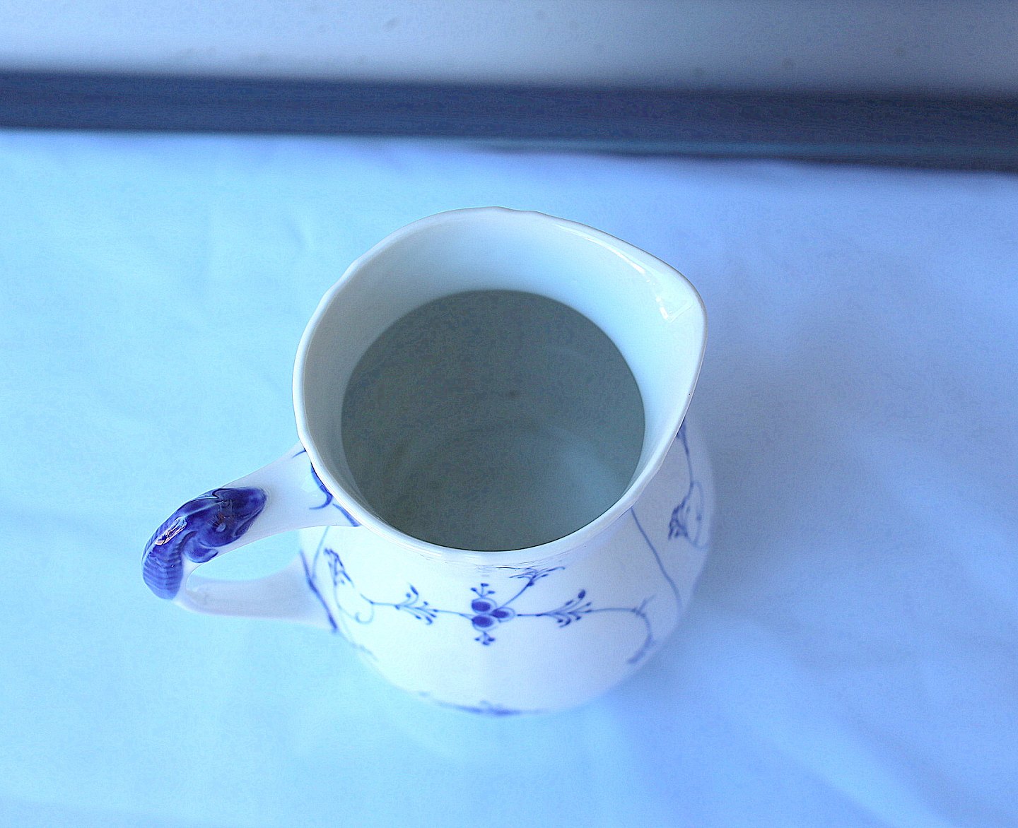 Bing & Grøndahl, musselmalet kande nr. 85. Kanden er hvidt porcelæn, med blåmalet mønster.