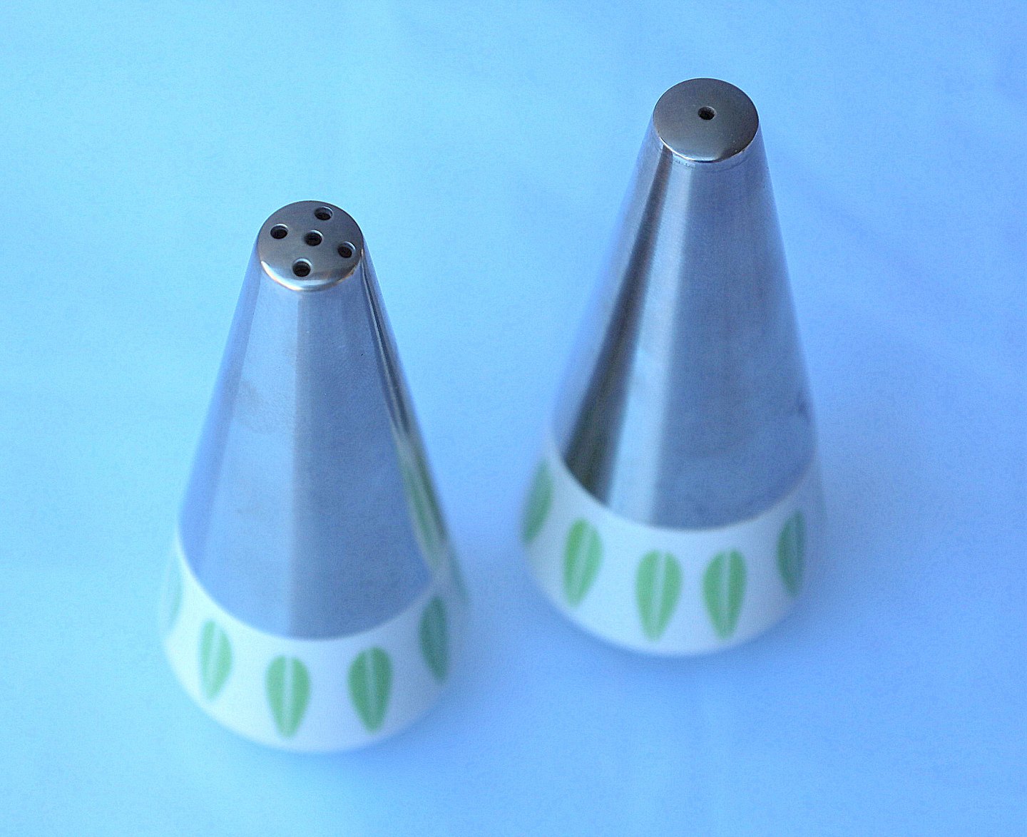 Lyngby Danild salt-og pebersæt, i Lotus- serien. Sættet er med top af stål og nederst, porcelæn med grøn Lotus dekoration.