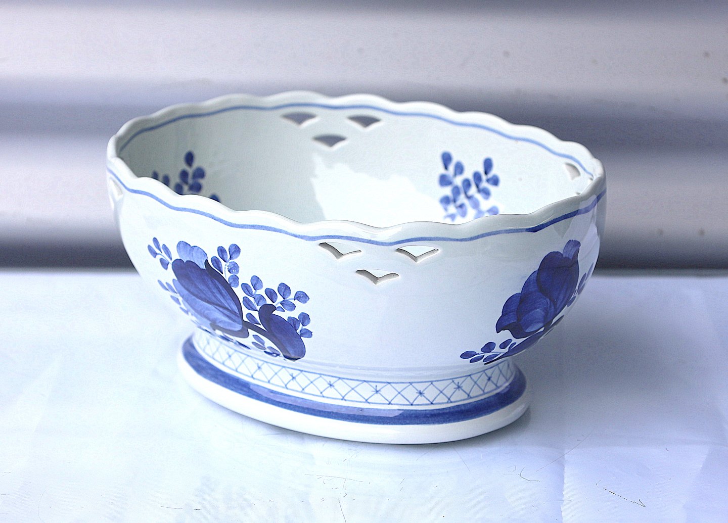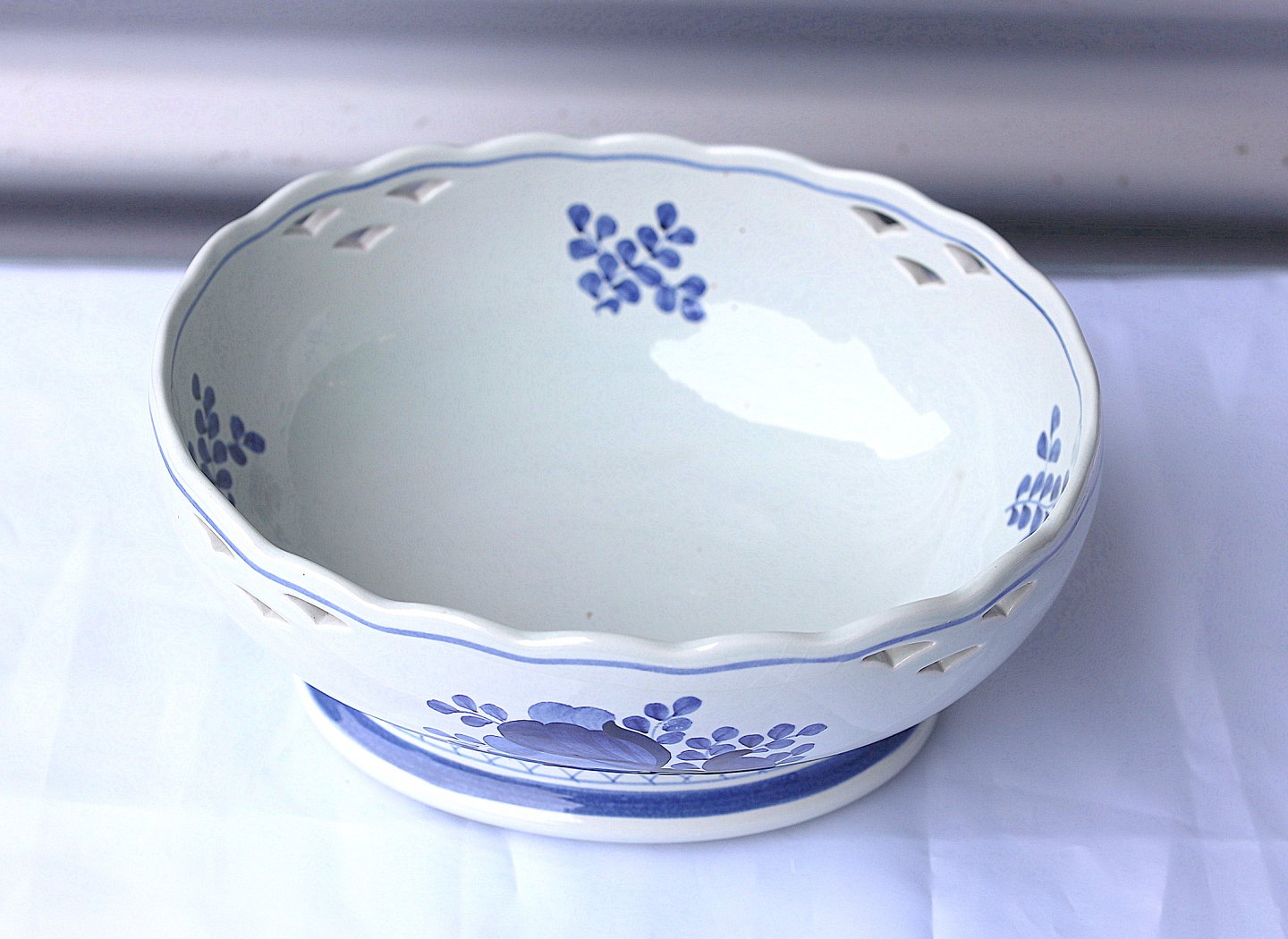 Aluminia Tranquebar, skål nr. 11/706. Oval skål, med blå dekoration og skålen er af fajance, på fod og gennembrudt kant