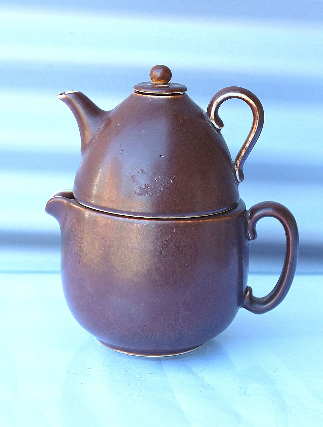 Rørstrand, Sweden. Gunnar Nylund, tekande/dobbeltkande. Sættet er af keramik oge i brune farver og består af en vandkande, nederst, og en tekande, øverst, tekanden har låg.