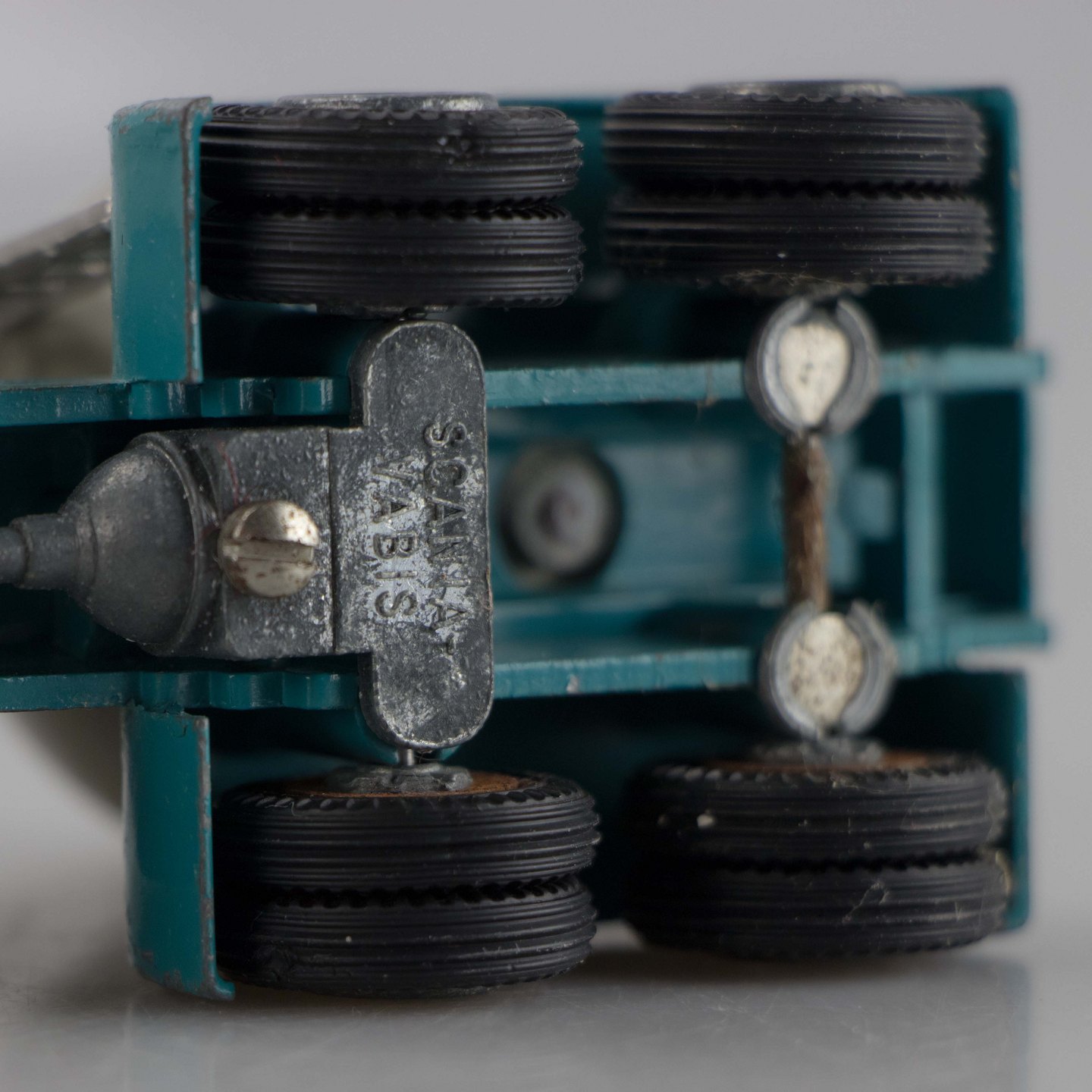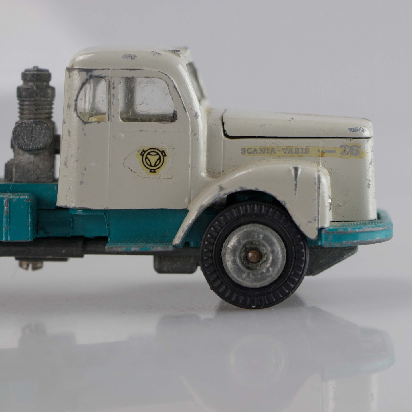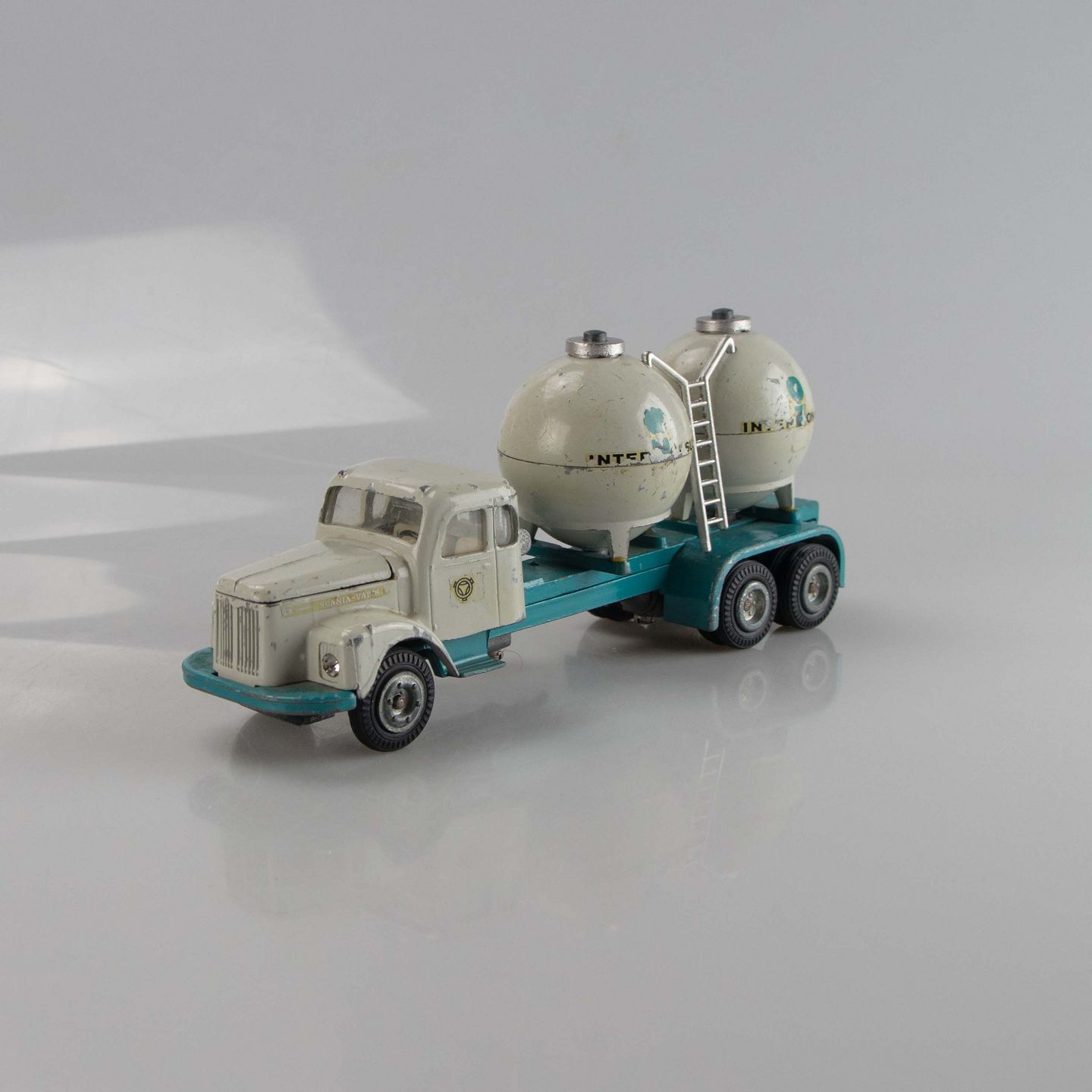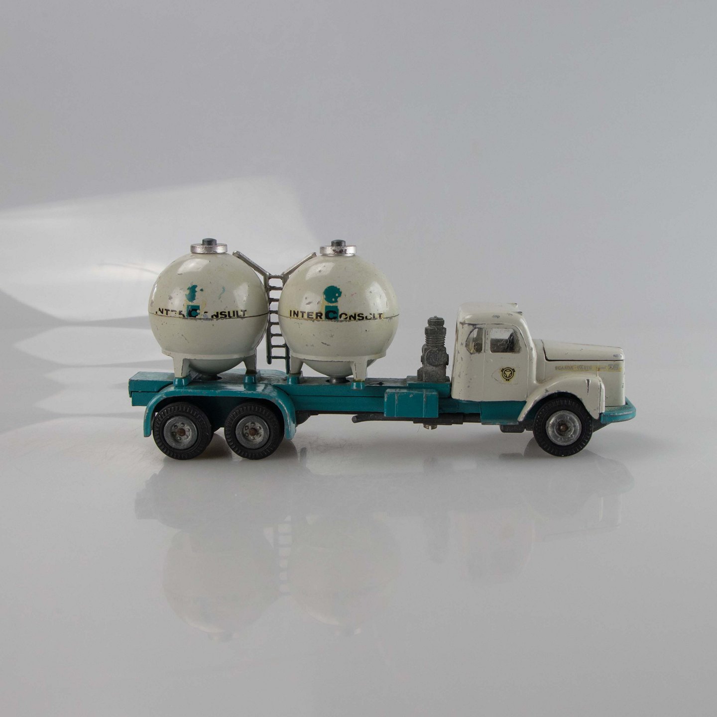 Lastbil i metal med motiv af en Scania Vabis med to Interconsult cementbeholdere.