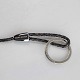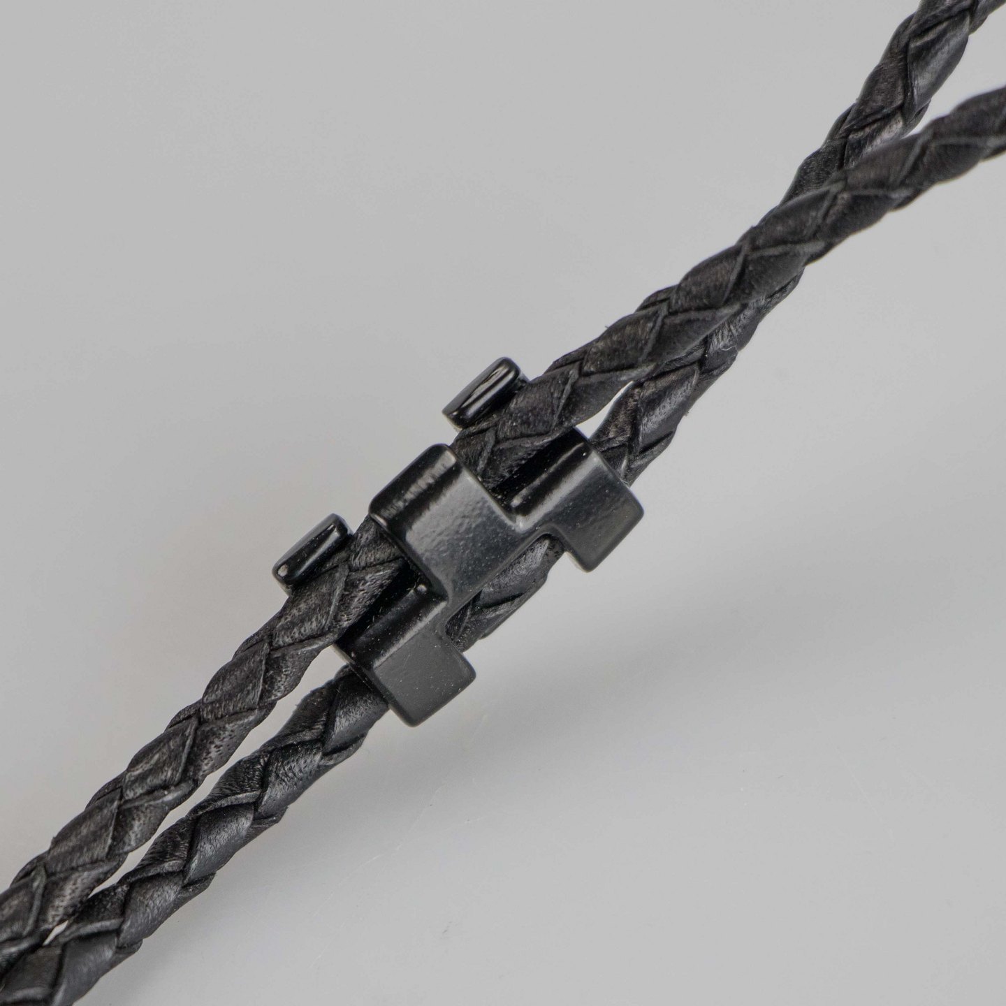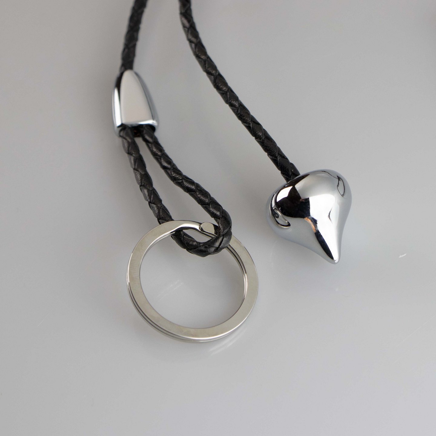 Kæde af flettet sort læder med dråbevedhæng og nøglering i stål