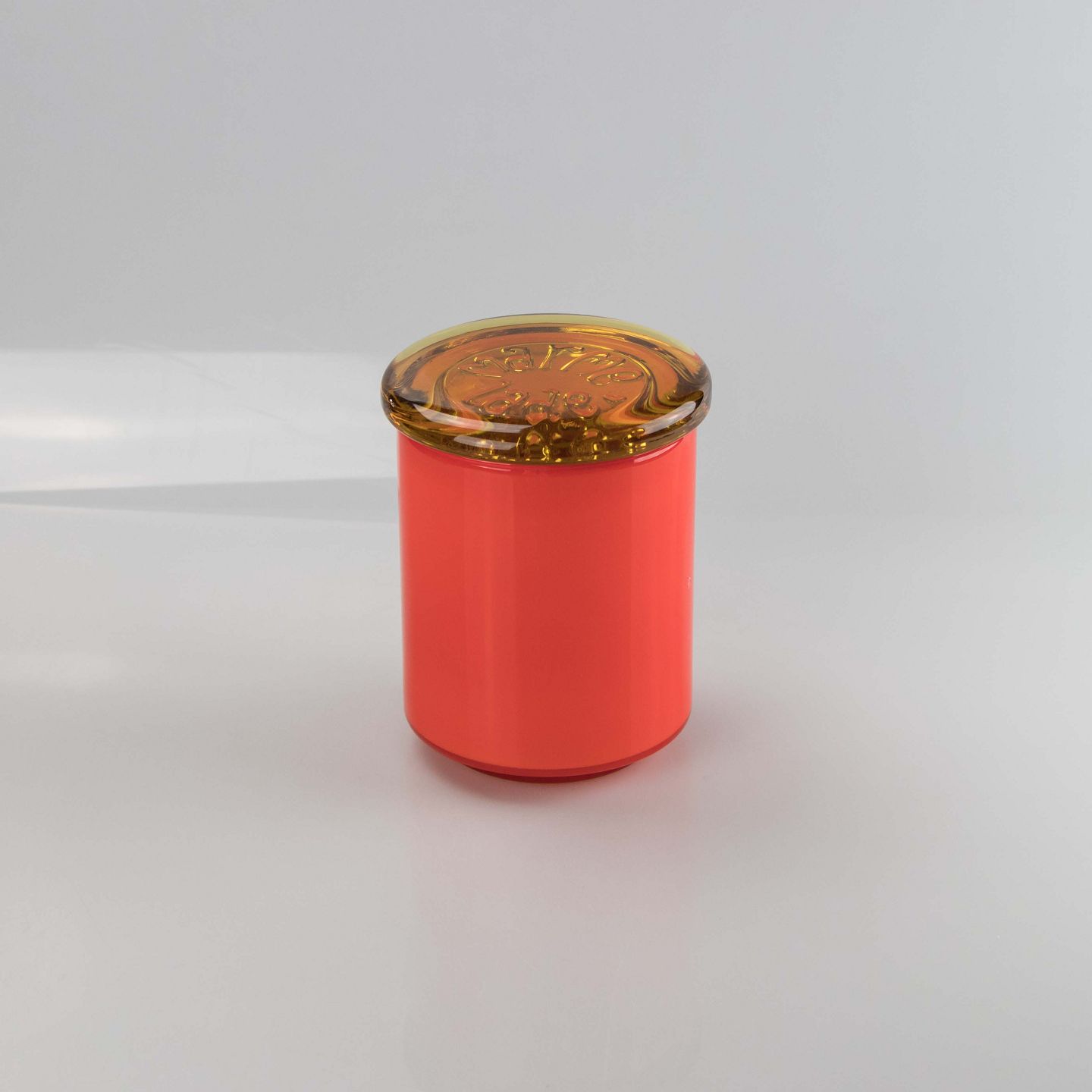 Krukke i orangerødt glas med opalhvid inderside og brungult låg i tykt glas.