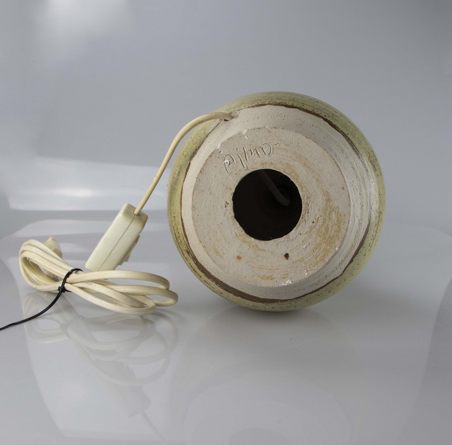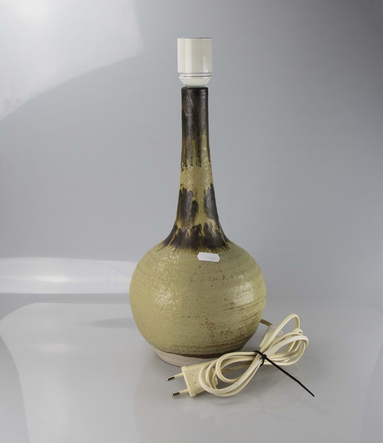 Lampe i stentøj med kugleformet fod og høj hals.