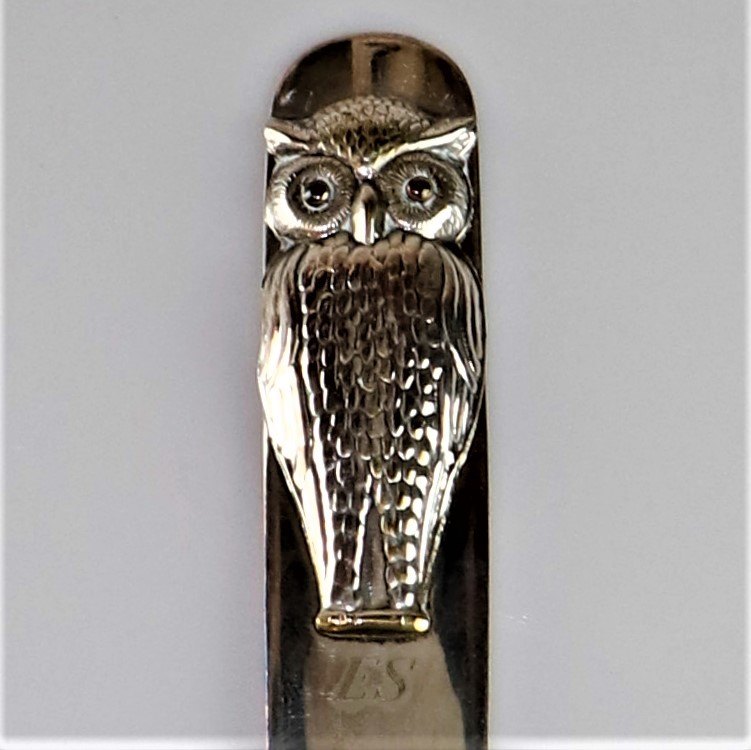 Brevkniv/papirkniv i pletsølv med motiv af ugle.
