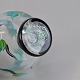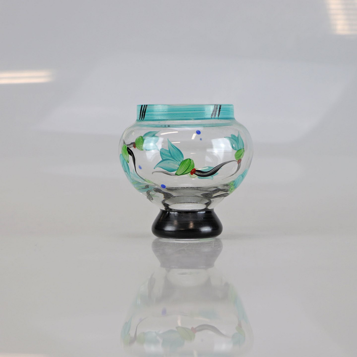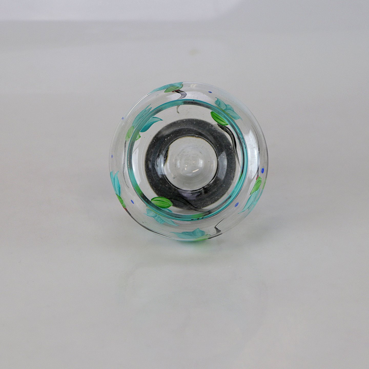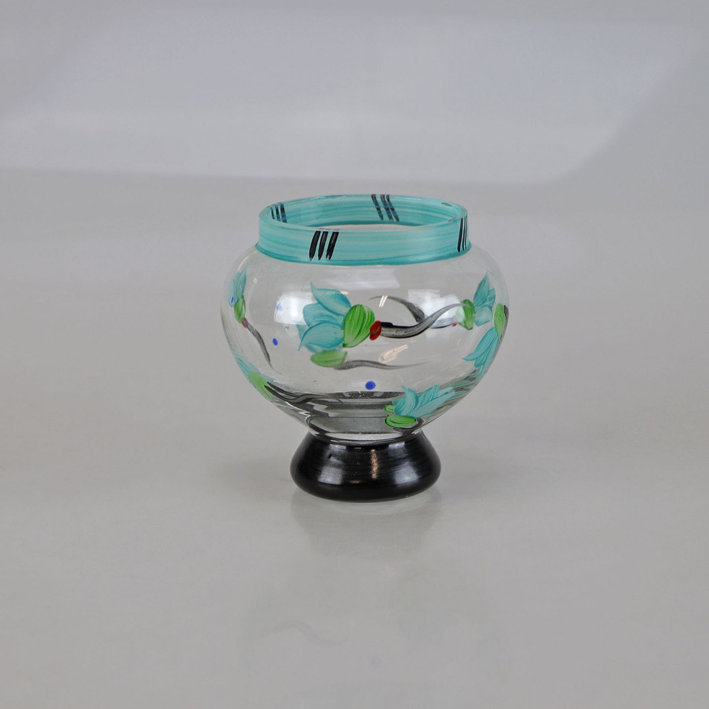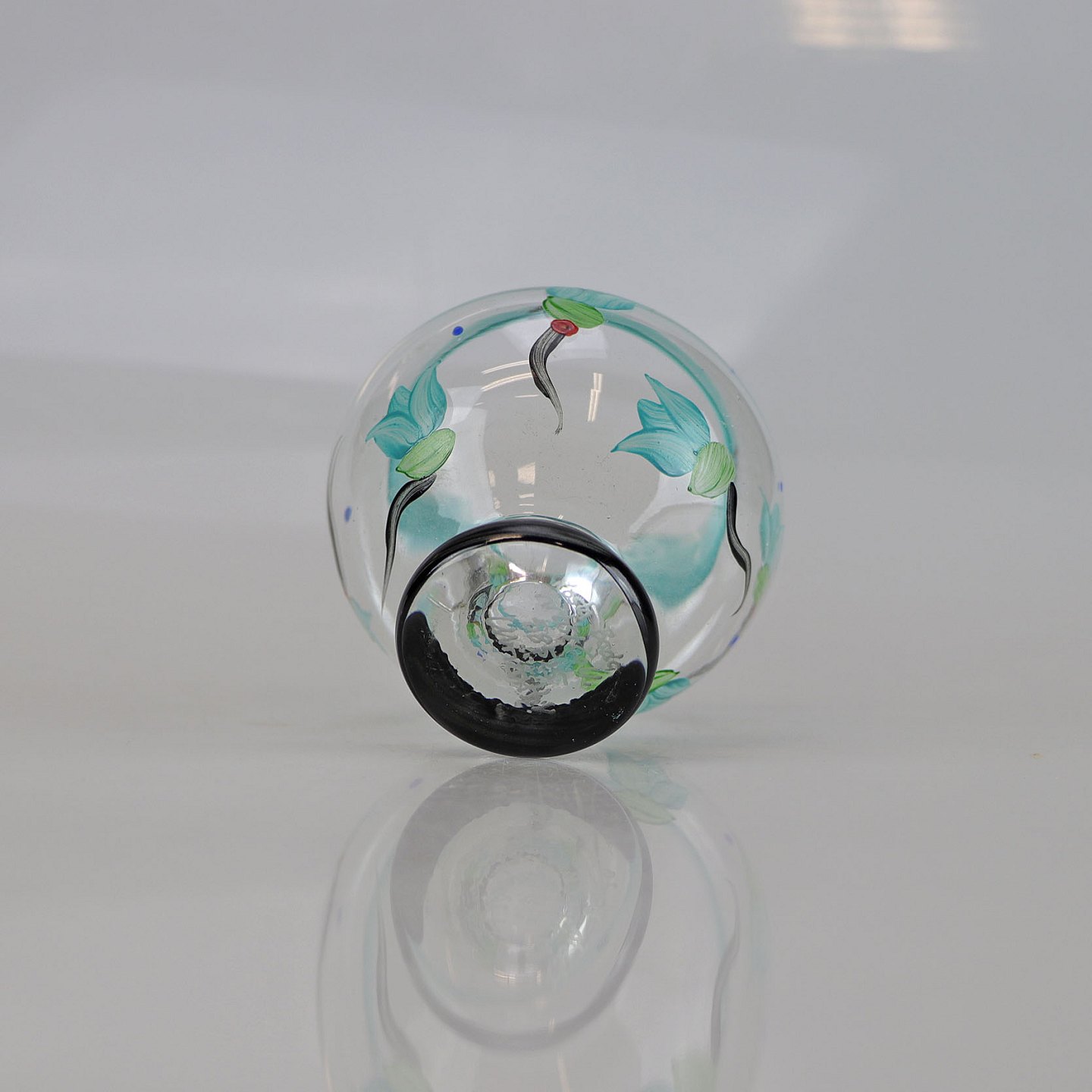 Vase i gennemsigtigt glas på sort fod med blomstermotiv