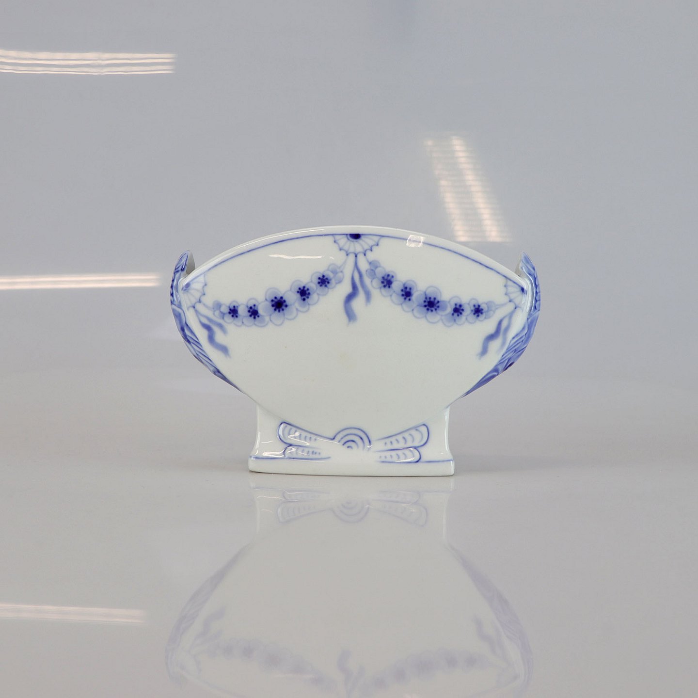Vase i hvidt porcelæn med skelform og motiv af guirlander med blå blomster