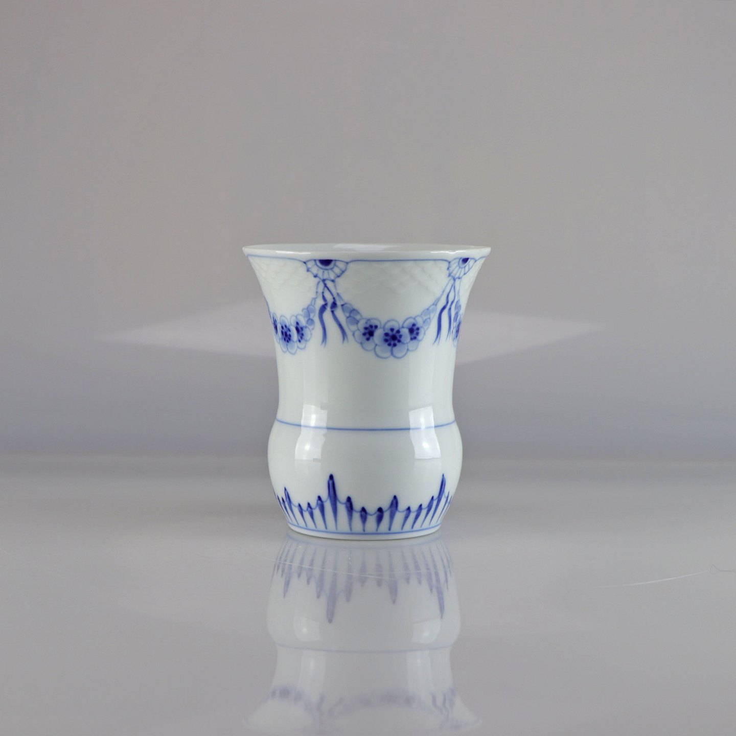 Blomstervase i hvidt porcelæn med skelform og motiv af guirlander med blå blomster