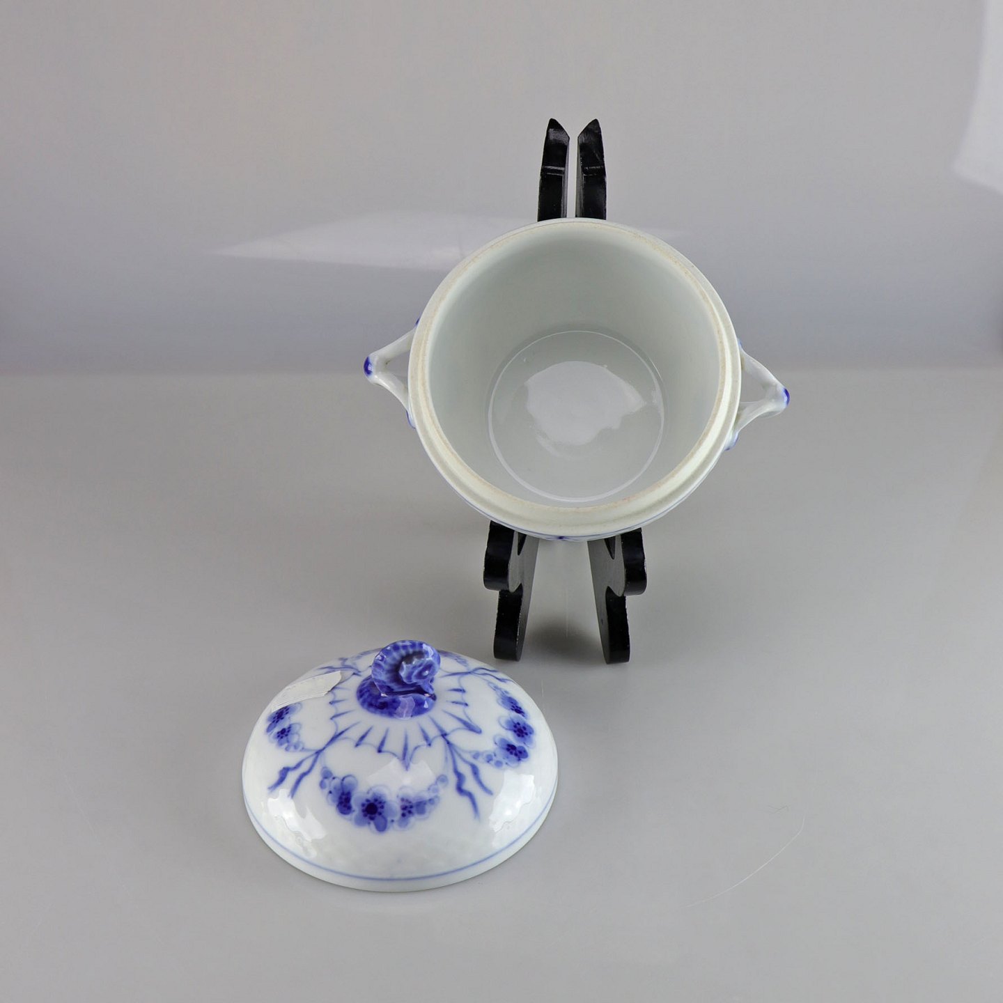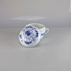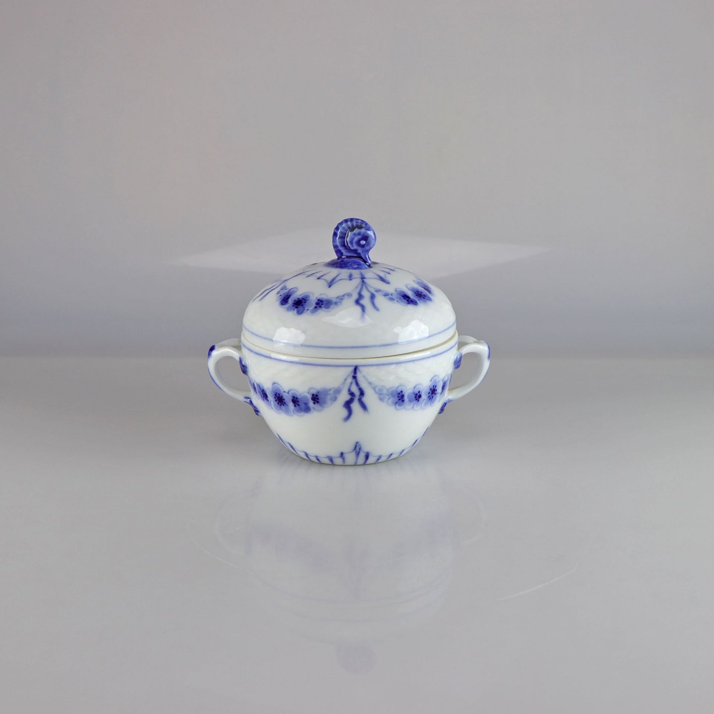 Skål med låg og hanke i hvidt porcelæn med skelform og motiv af guirlander med blå blomster samt blå søhest