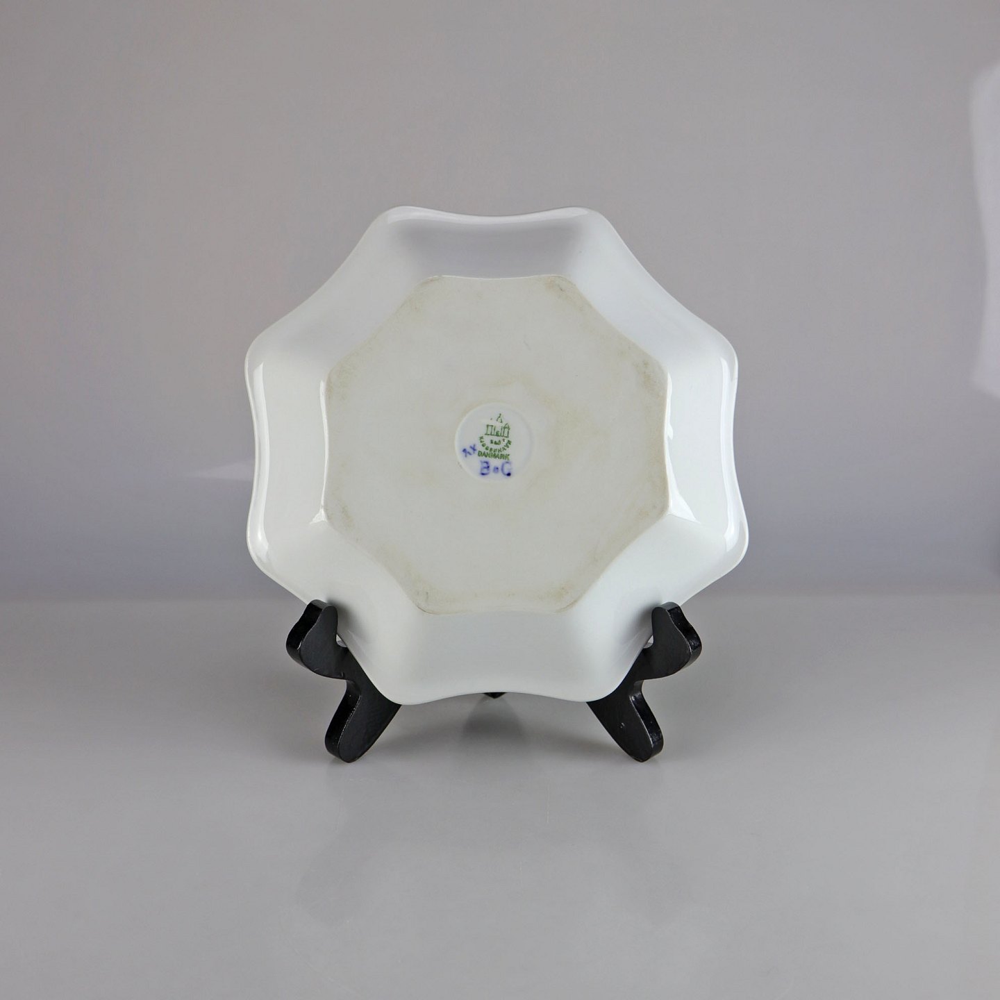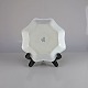 Kantet fad med hank i hvidt porcelæn med skelform og motiv af guirlander med blå blomster samt blå søhest