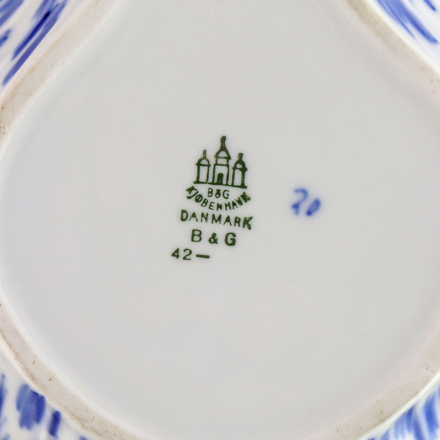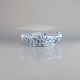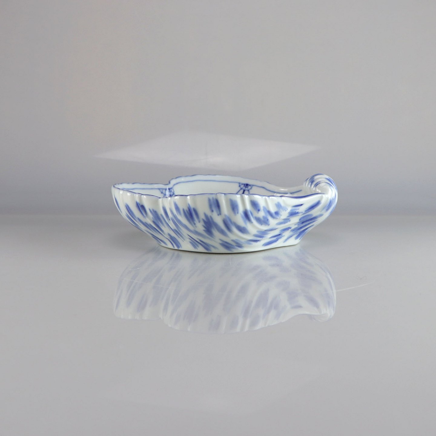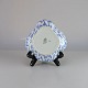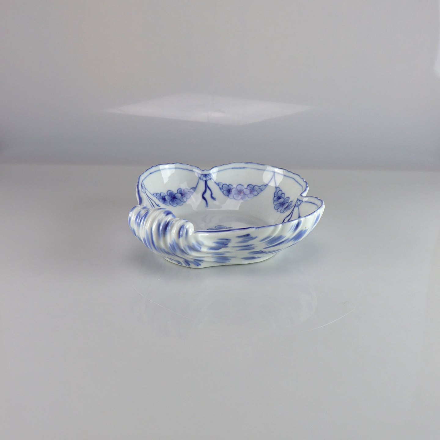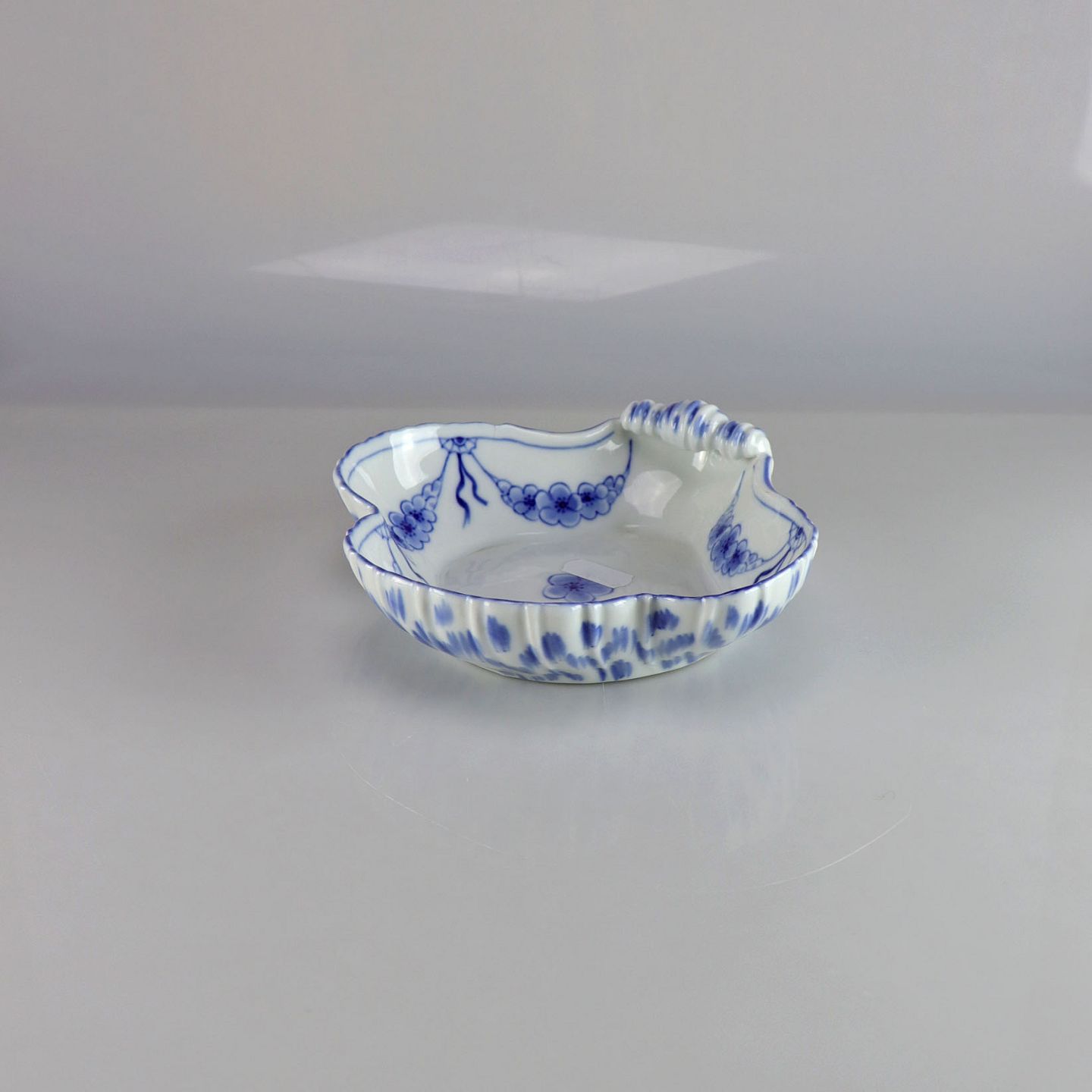 Konfektskål i hvidt porcelæn med skelform og motiv af guirlander med blå blomster