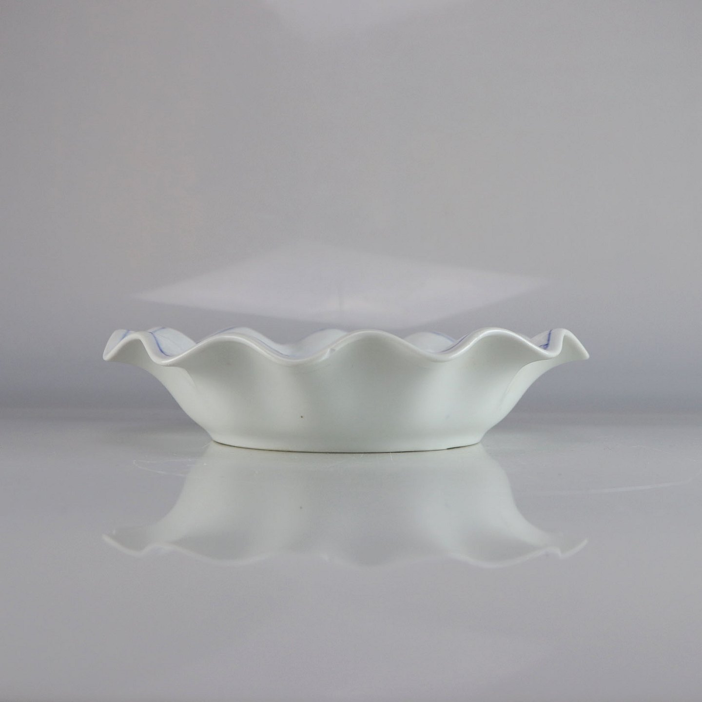 Skål i hvidt porcelæn med skelform og motiv af guirlander med blå blomster