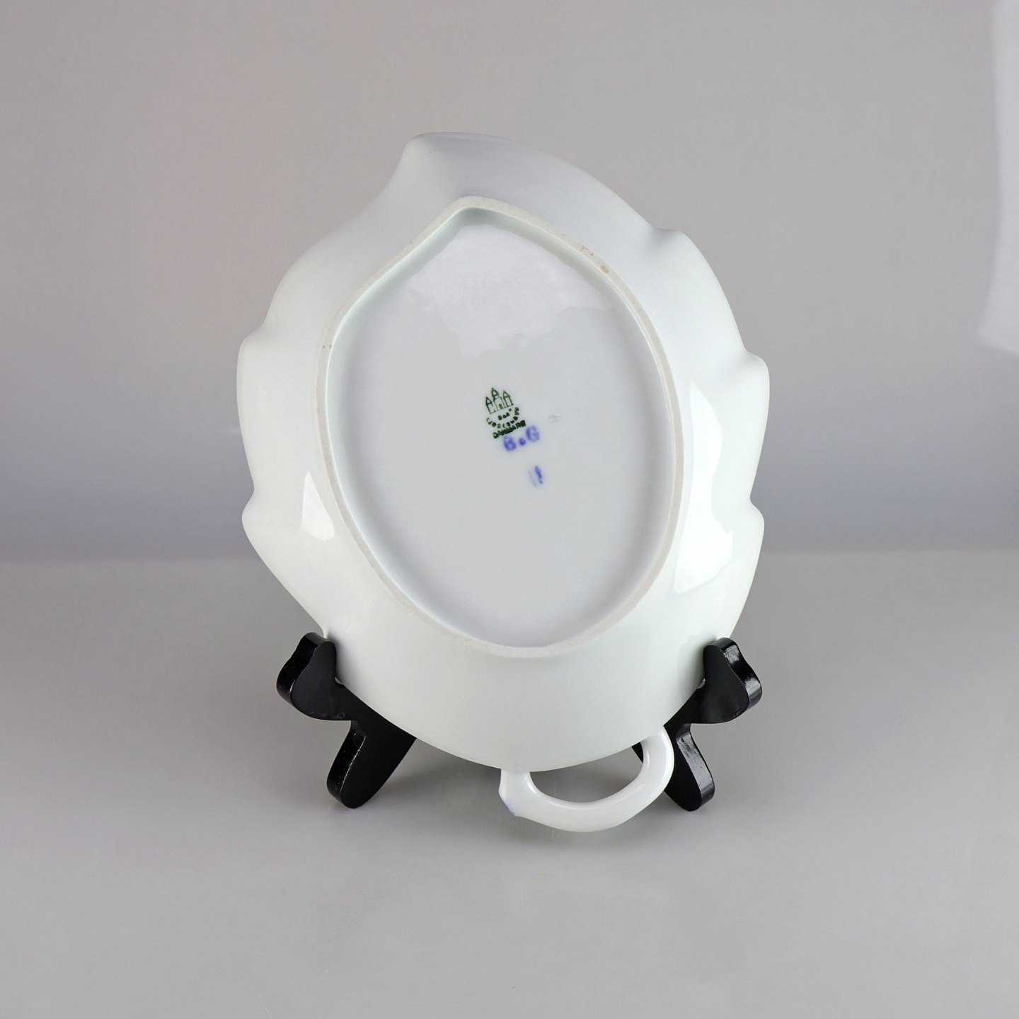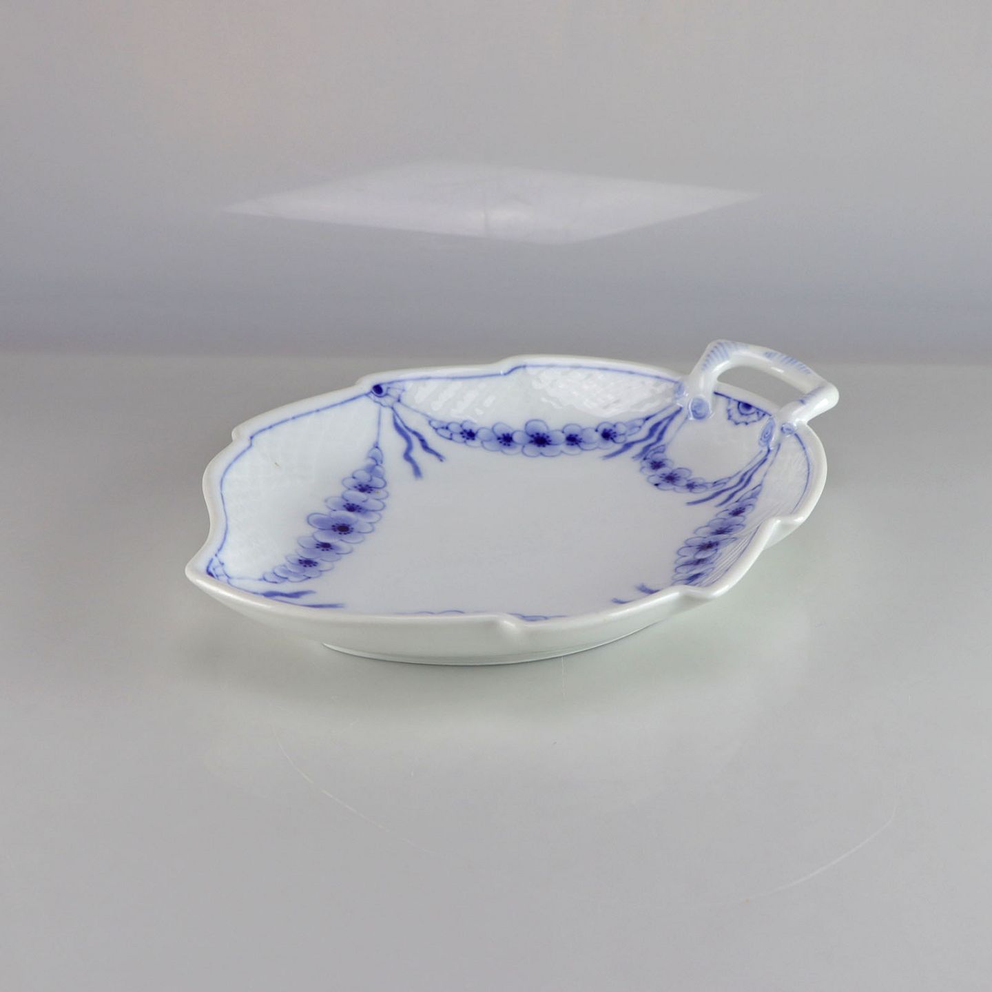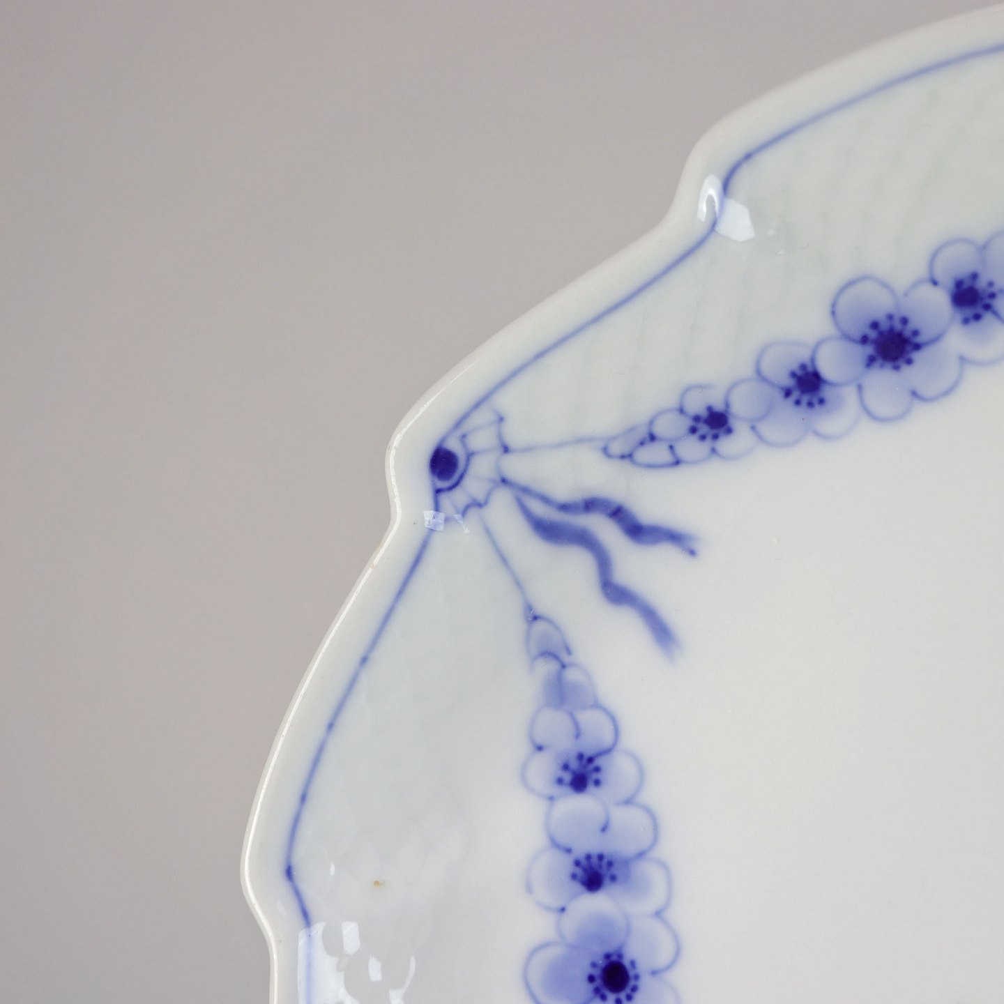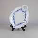 Kagefad i hvidt porcelæn med skelform og motiv af guirlander med blå blomster