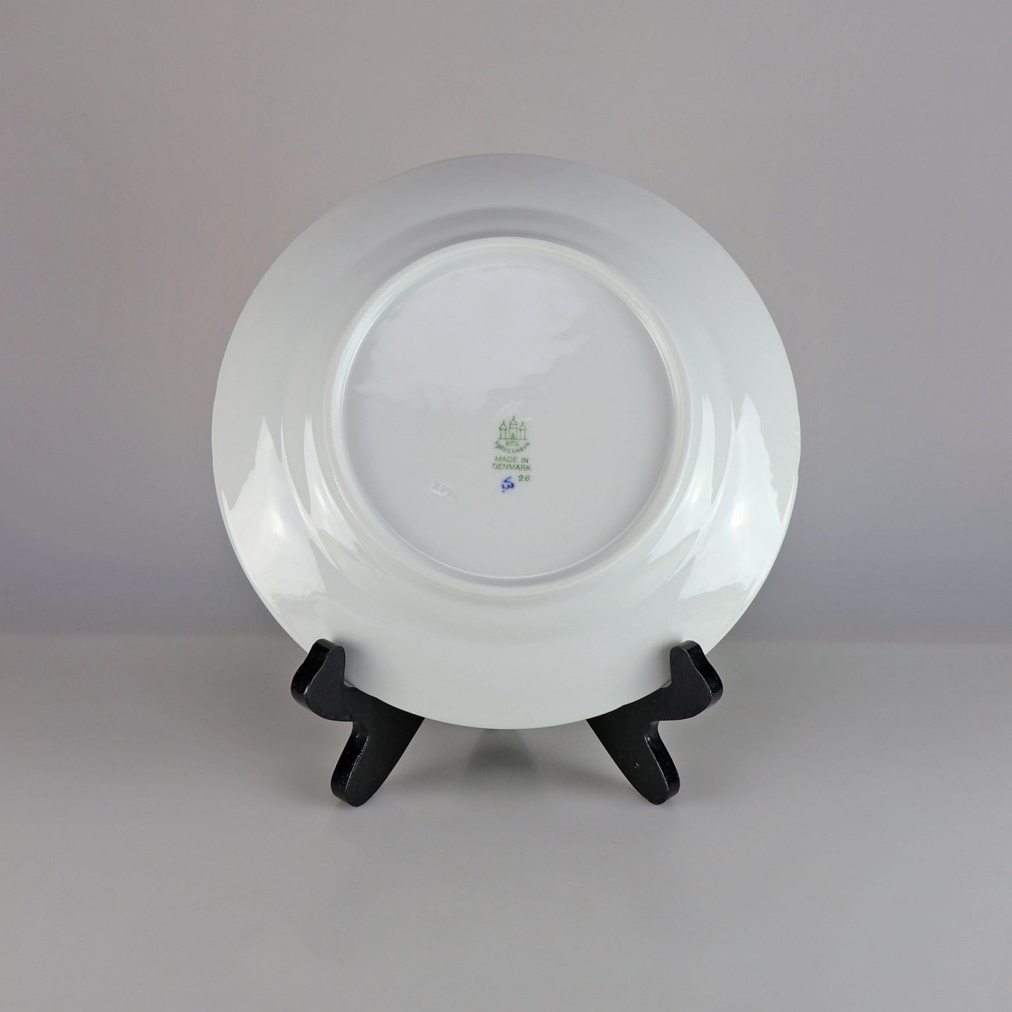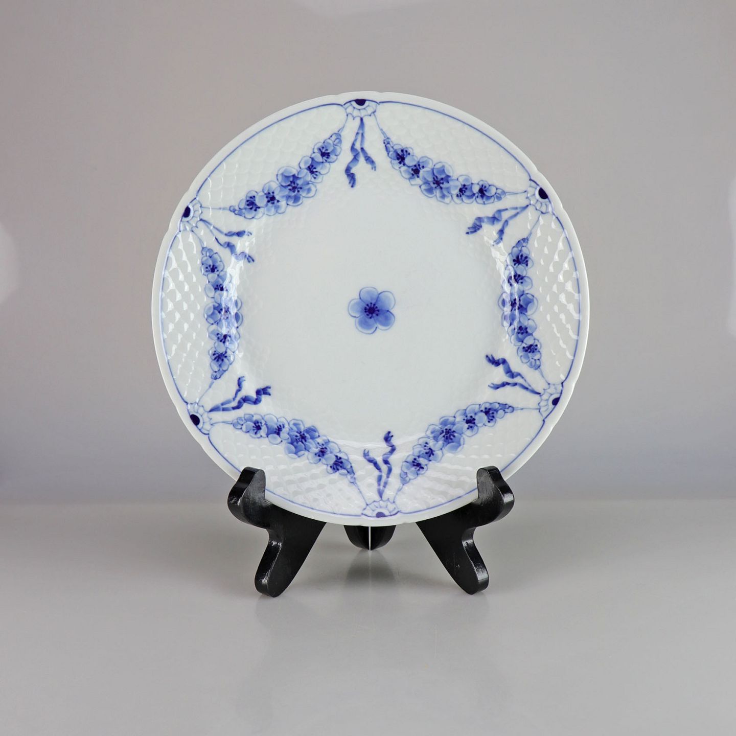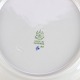 Spisetallerken i hvidt porcelæn med skelform og motiv af guirlander med blå blomster