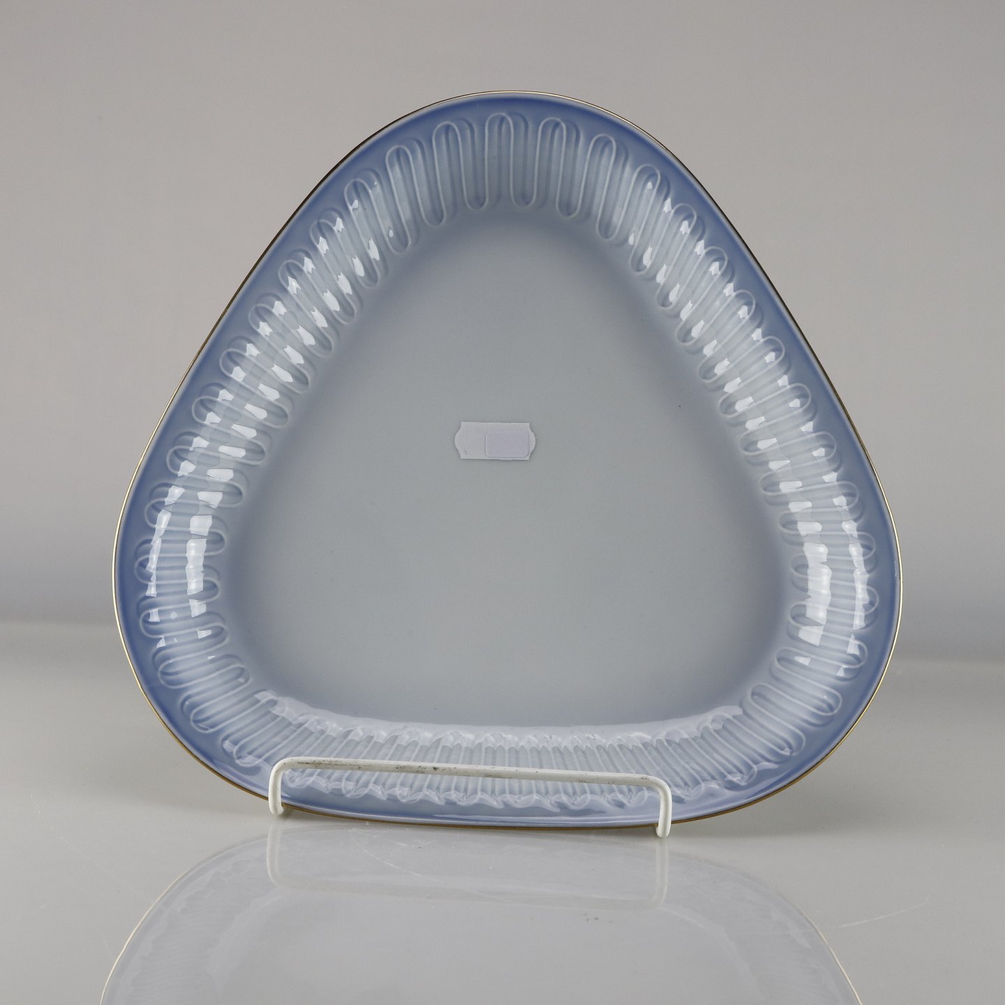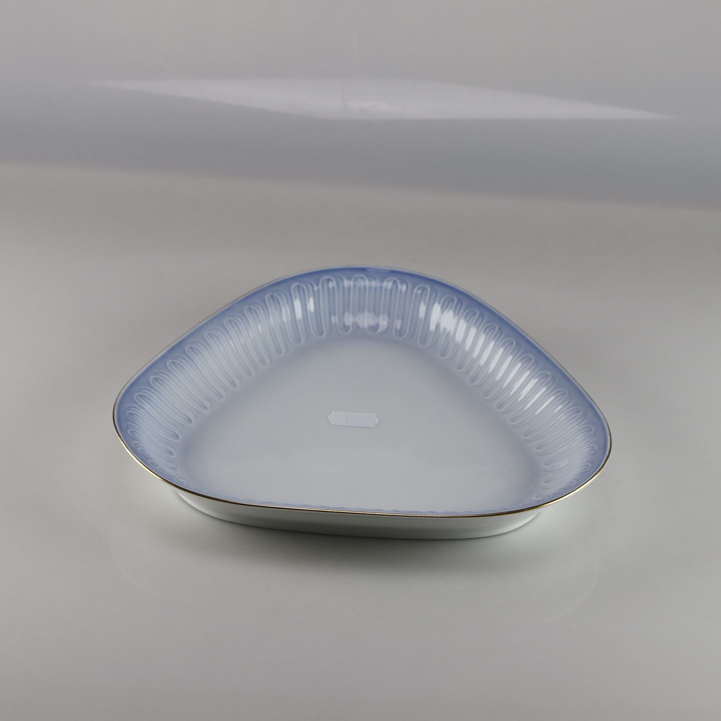 Trekantet porcelæns asiet med guld kant.