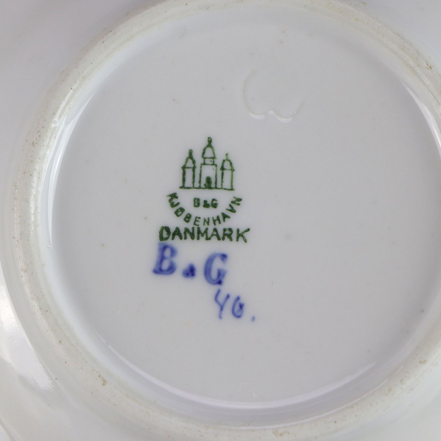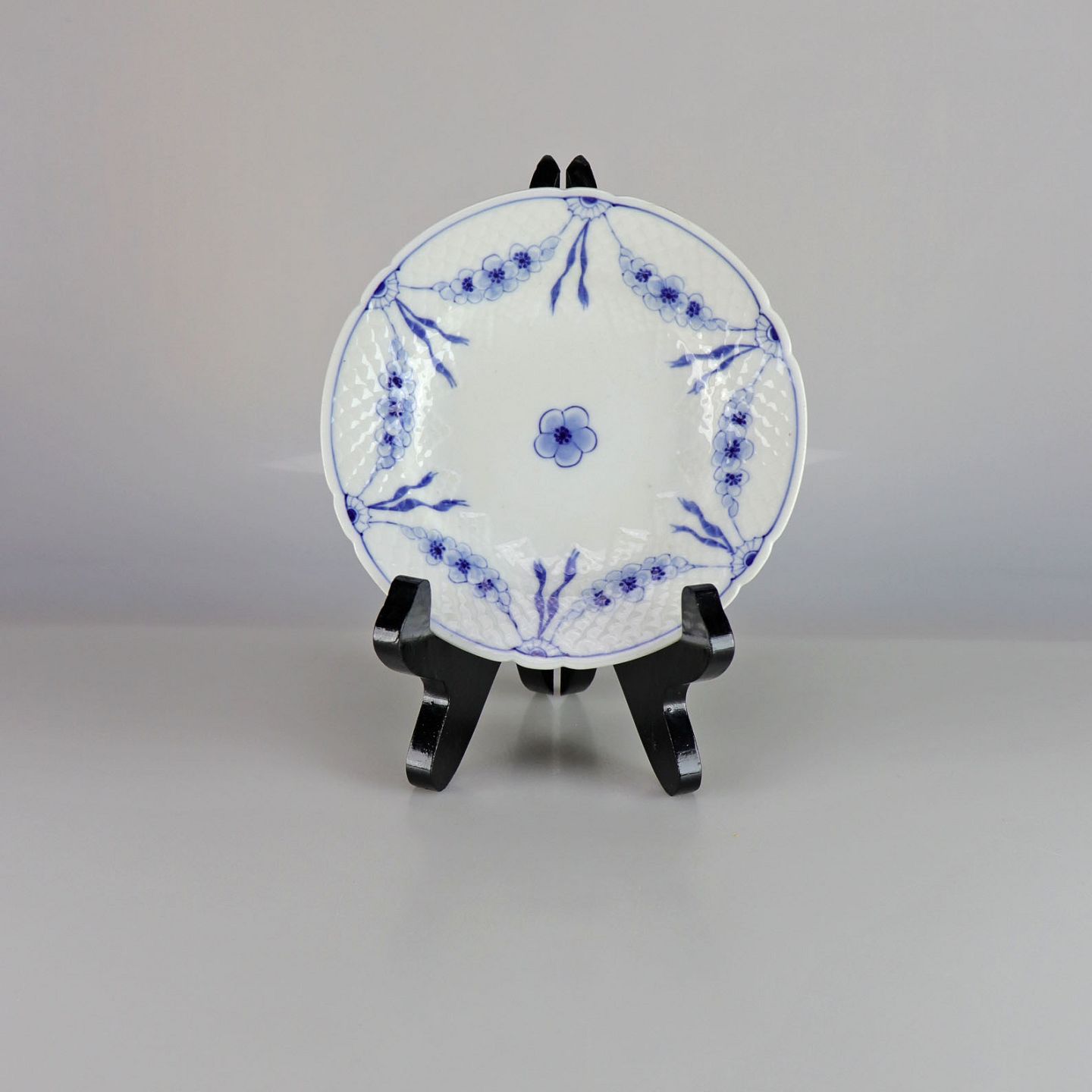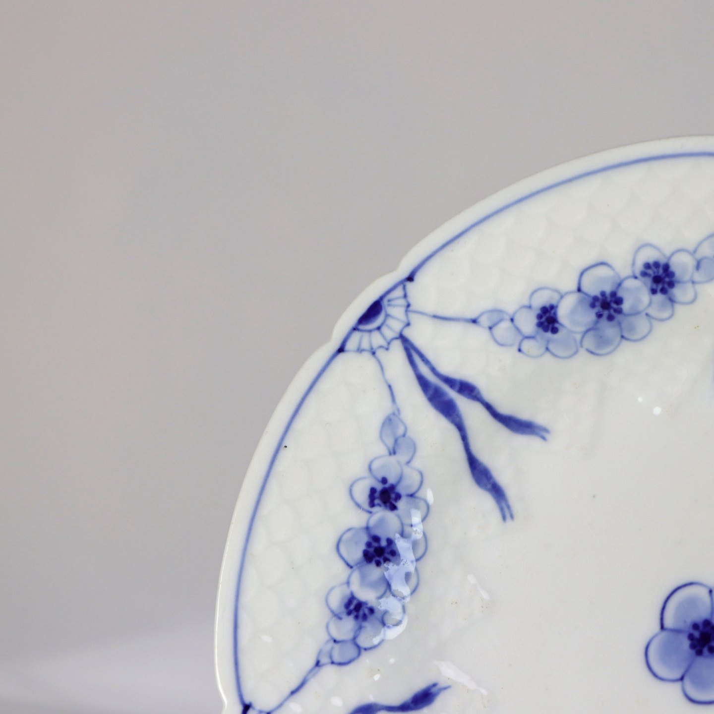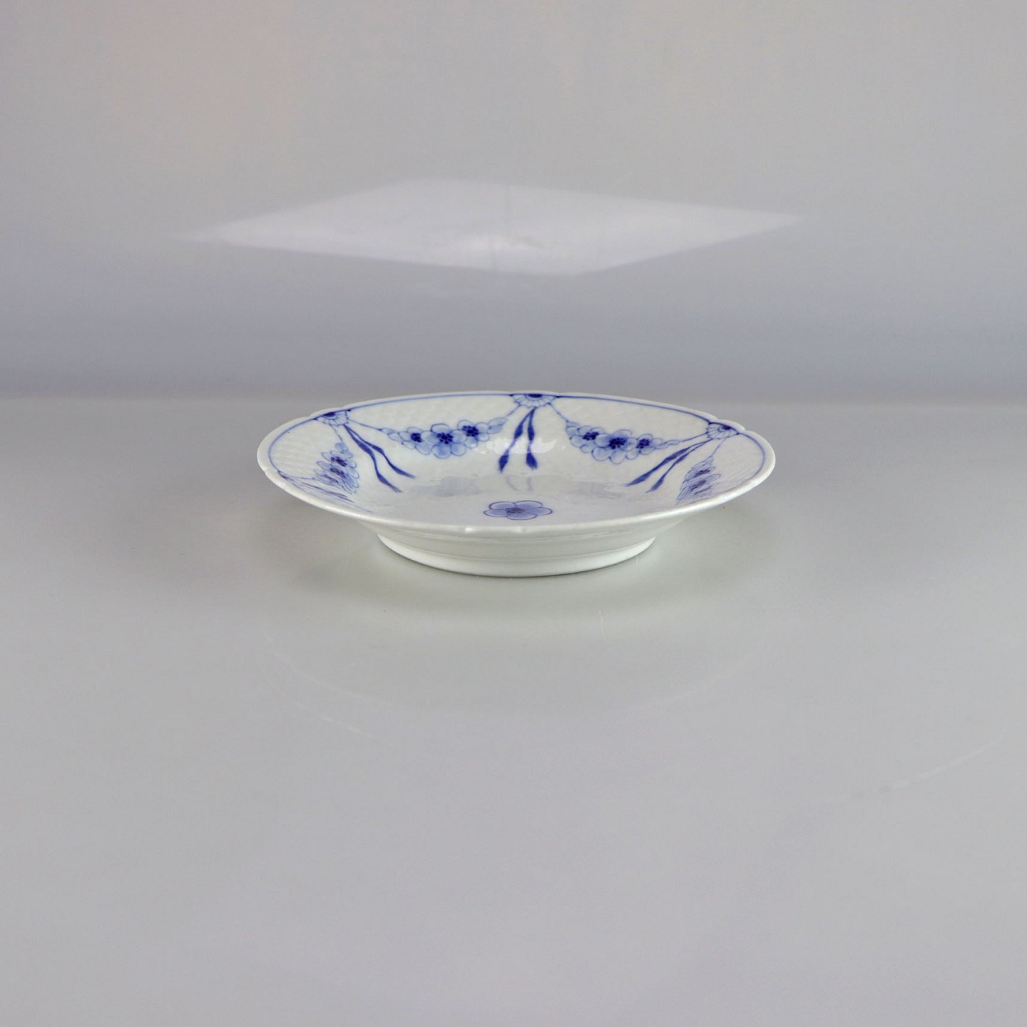 Smørkuvert i hvidt porcelæn med skelform og motiv af guirlander med blå blomster