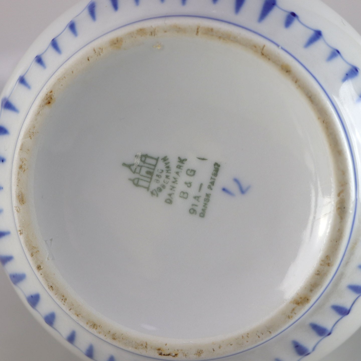 Kande i hvidt porcelæn med skelform og motiv af guirlander med blå blomster
