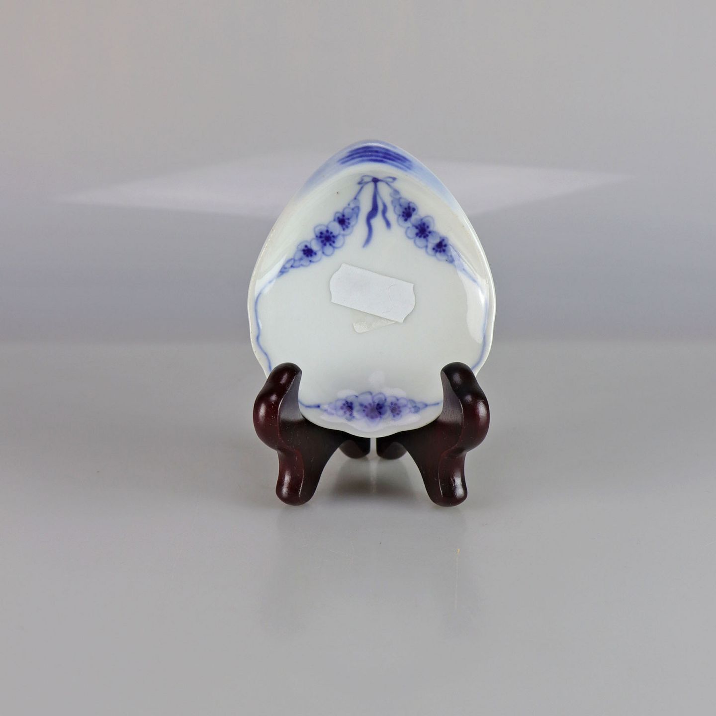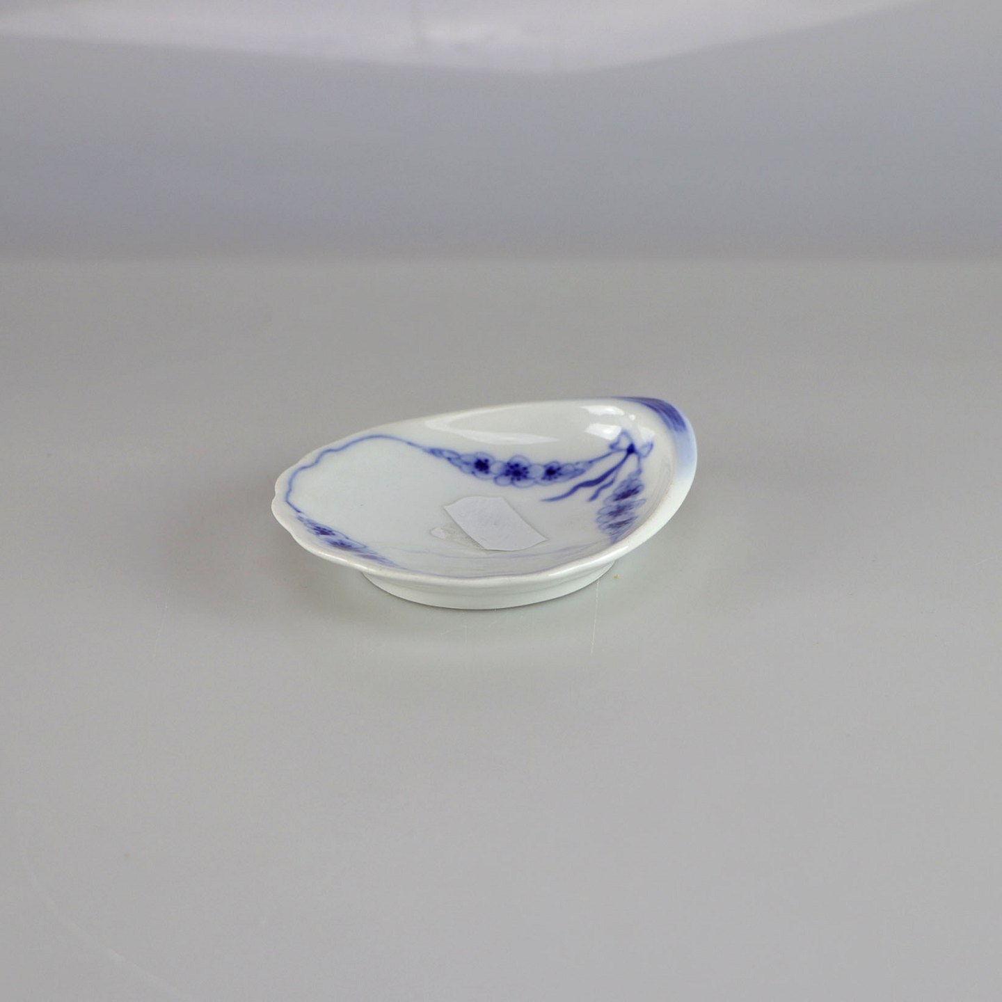 Asiet i hvidt porcelæn med skelform og motiv af guirlander med blå blomster