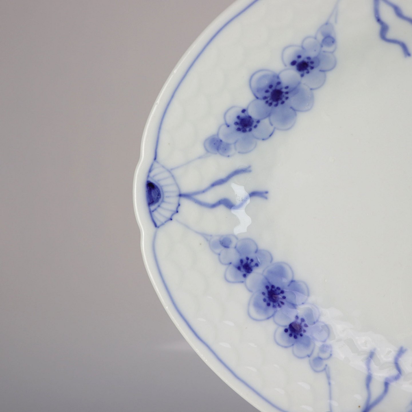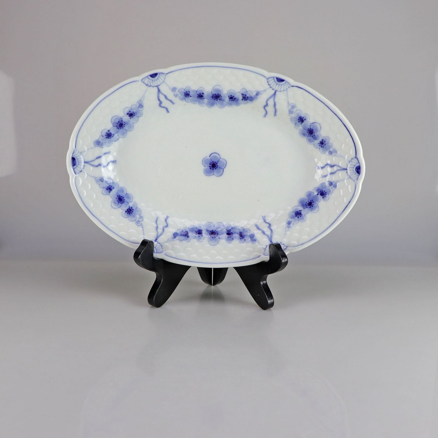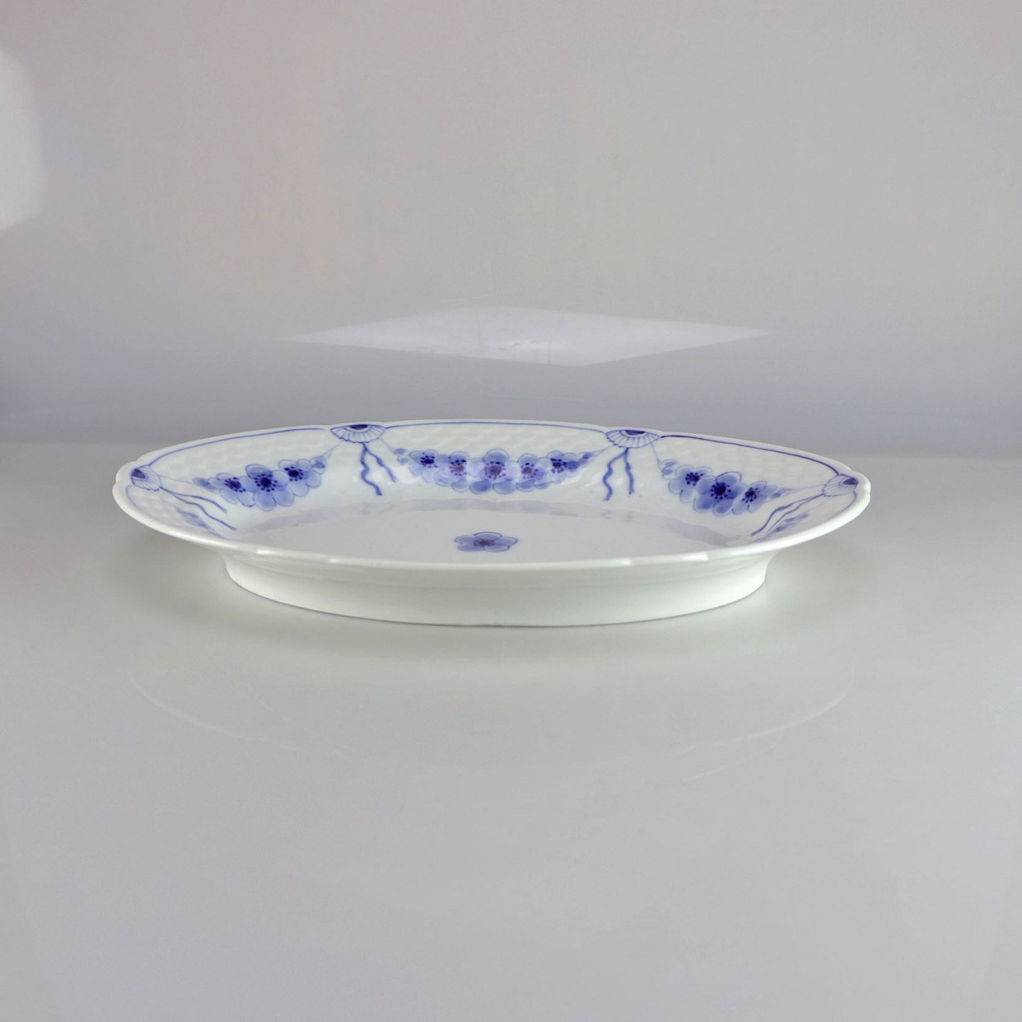 Fad i hvidt porcelæn med skelform og motiv af guirlander med blå blomster