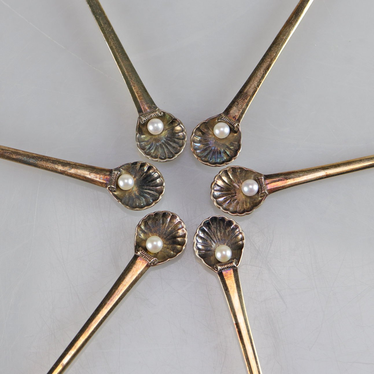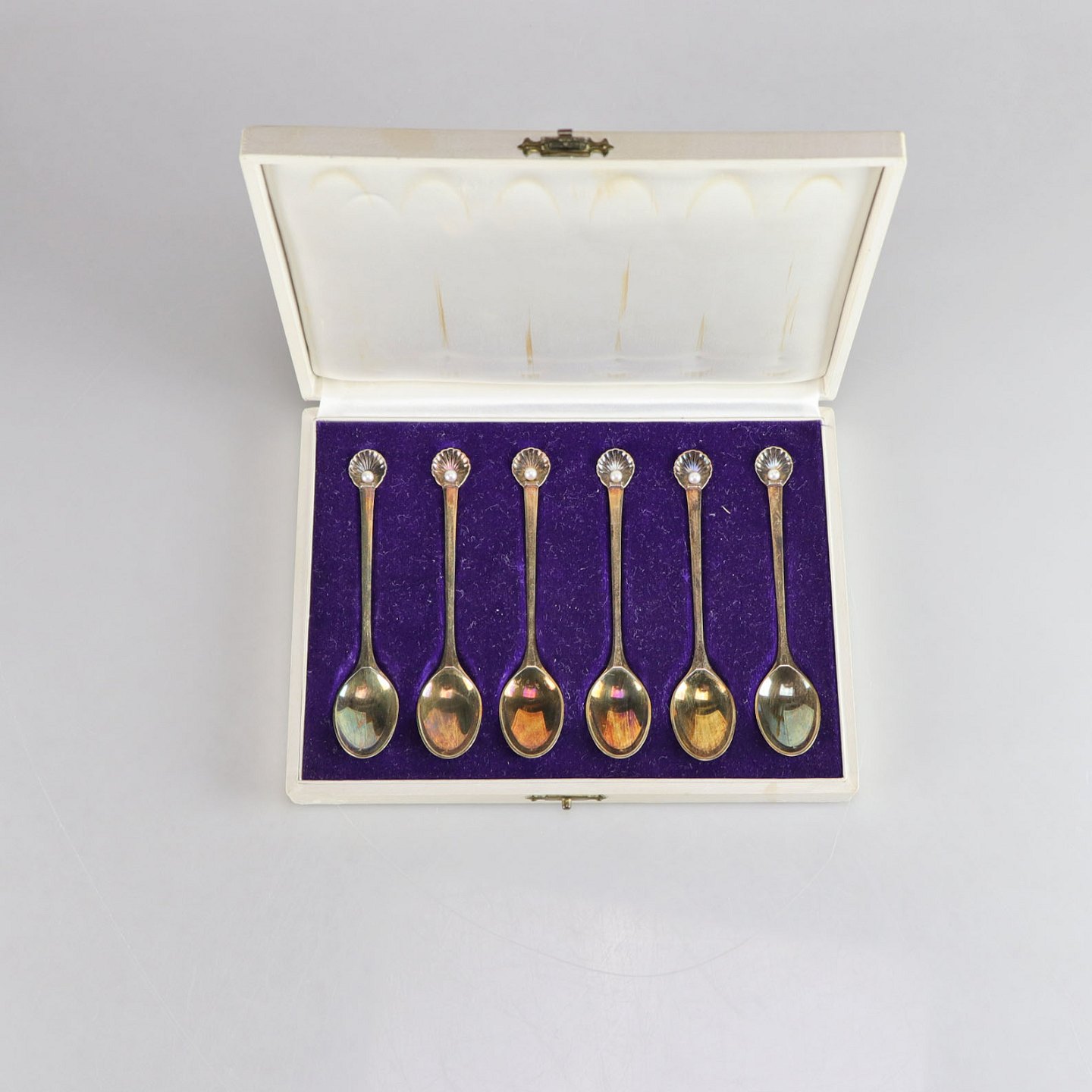 Bokssæt med seks t-skeer i sterling sølv med monteret perle