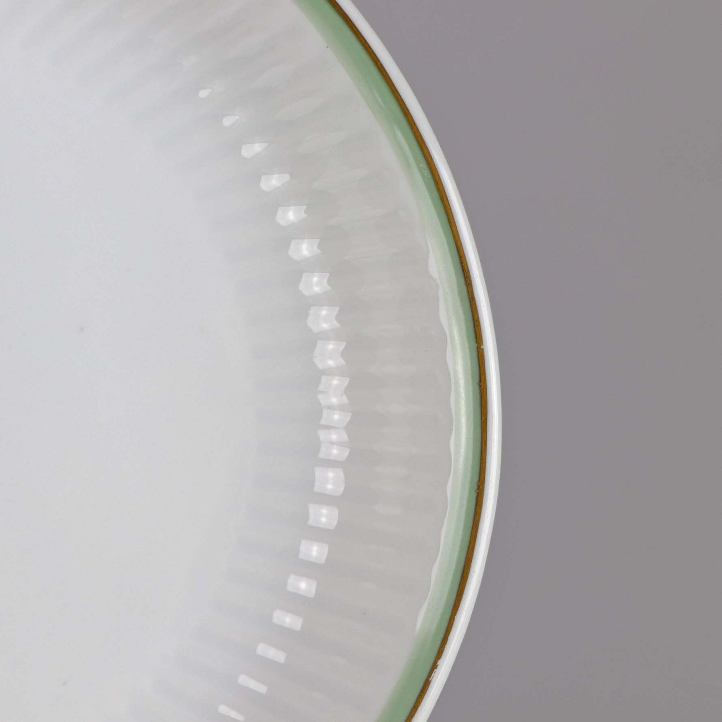 Riflet hvid porcelæn med dekoration af grønne blomster samt grønt bånd og guldkant