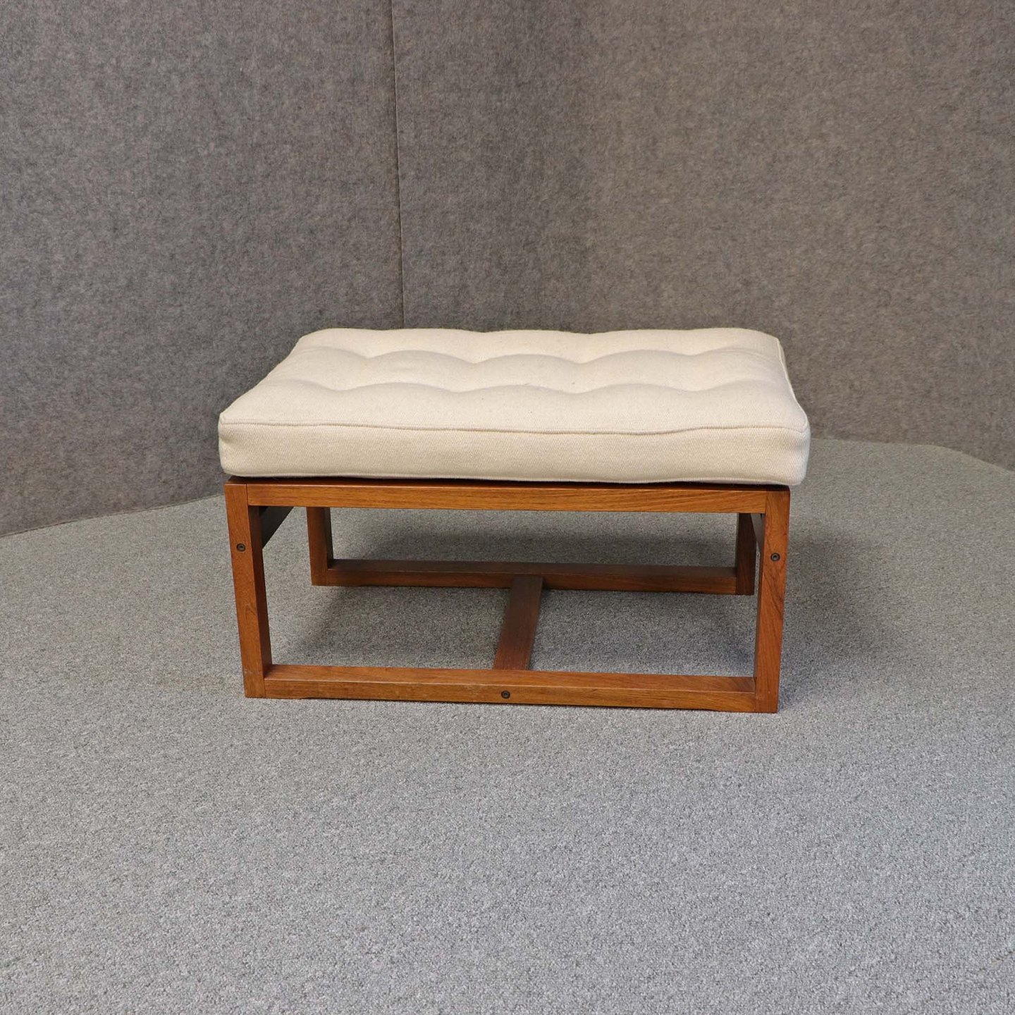 Skammel stel i teak med polstret hynde med rådhvid uldbetræk