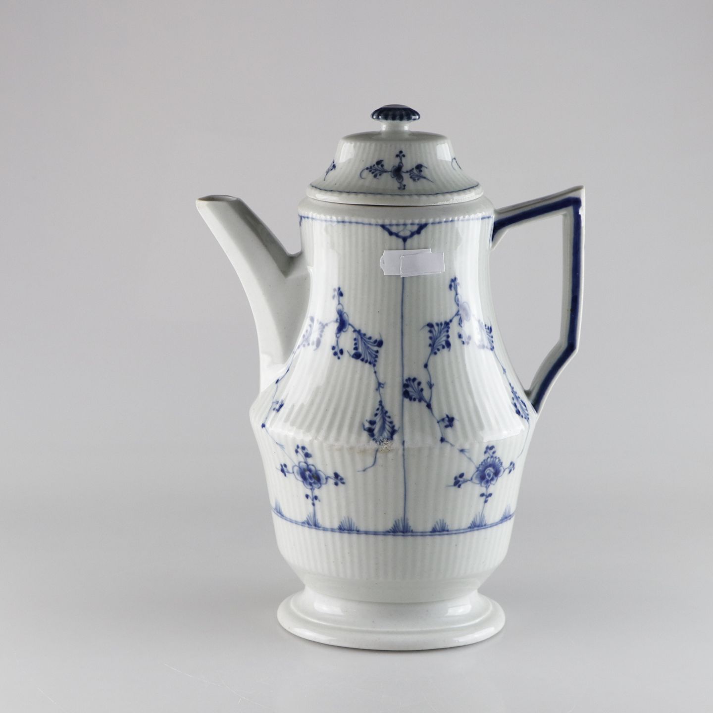 Kongelig musselmalet riflet kande med hank og låg