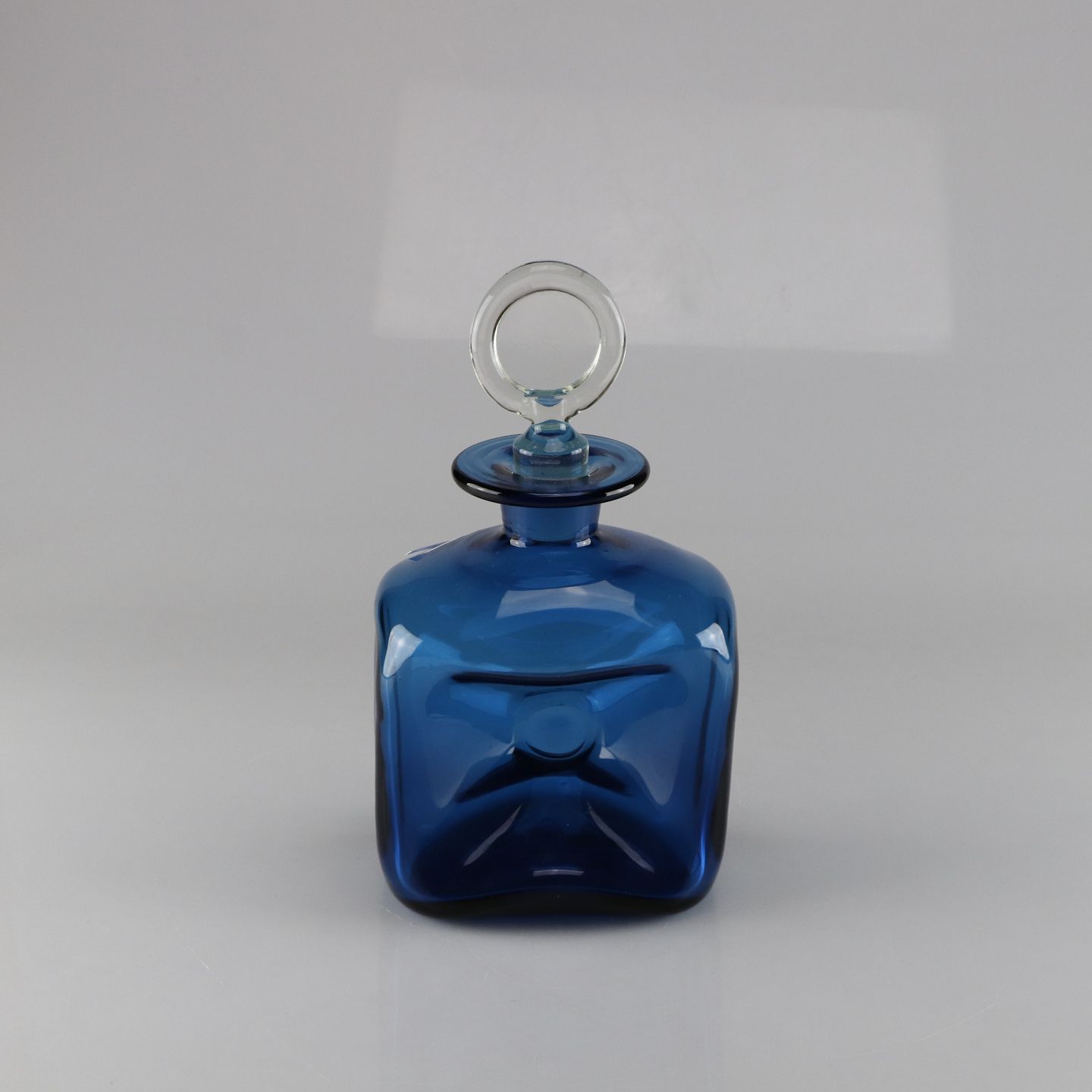 Kvadratisk karaffel sammenklemt på midten lavet af blåt glas
