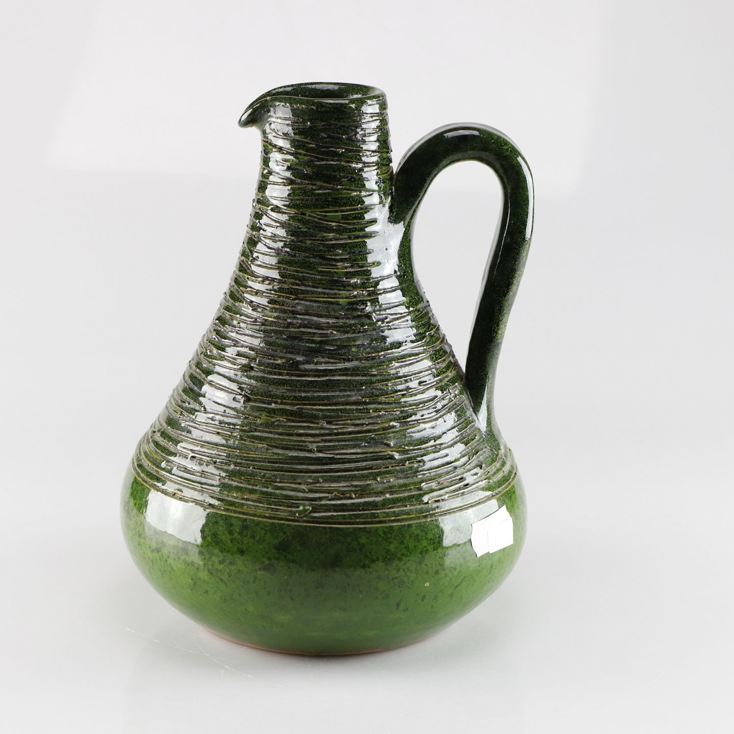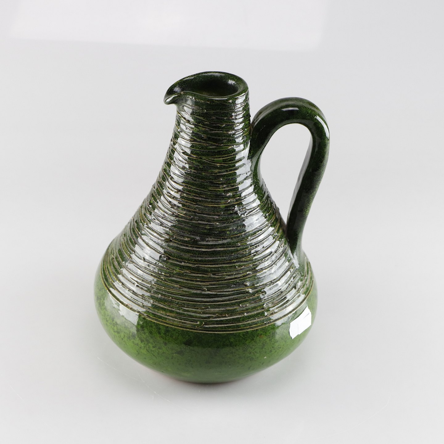 Keramik kande i grøn, dekoreret med riller, hank og lille hældetud