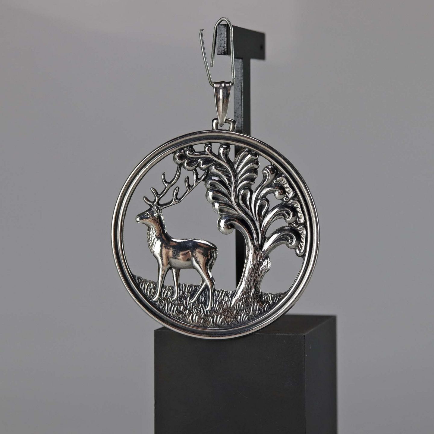 Rundt vedhæng i sølv med motiv af hjort og træ