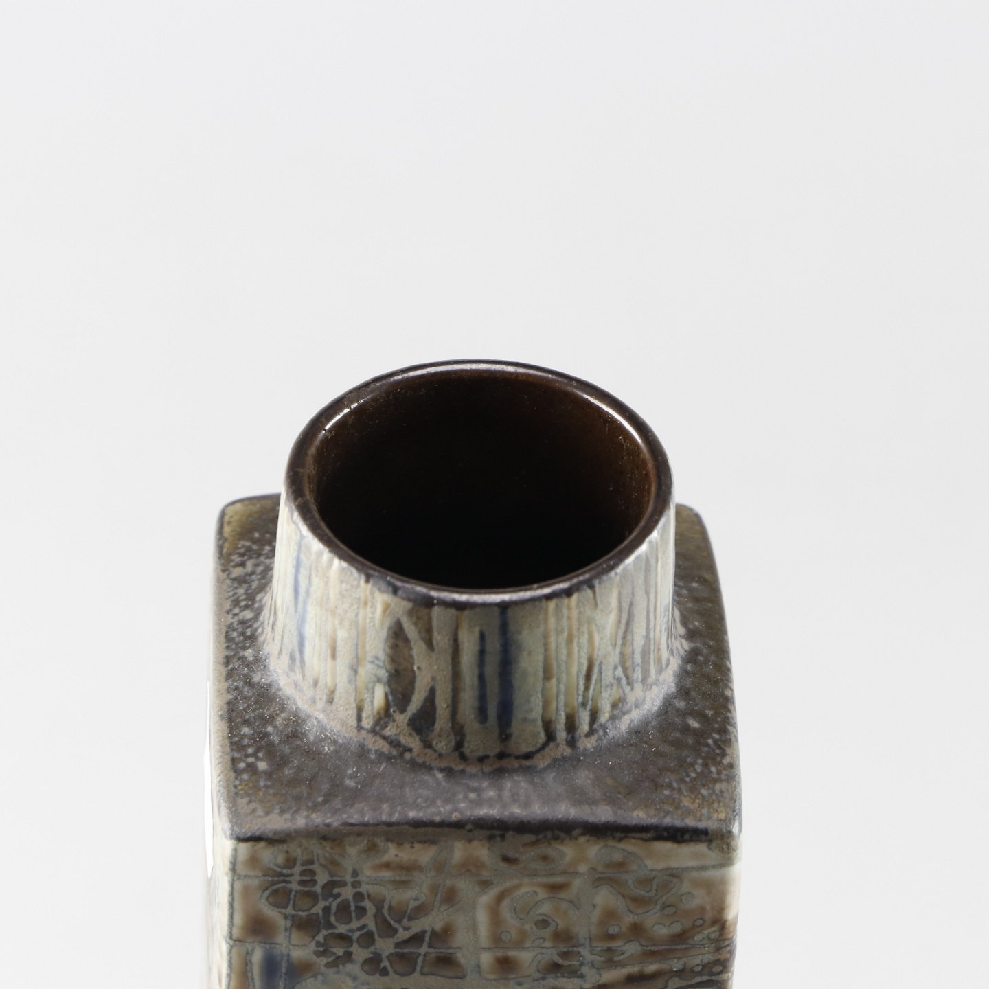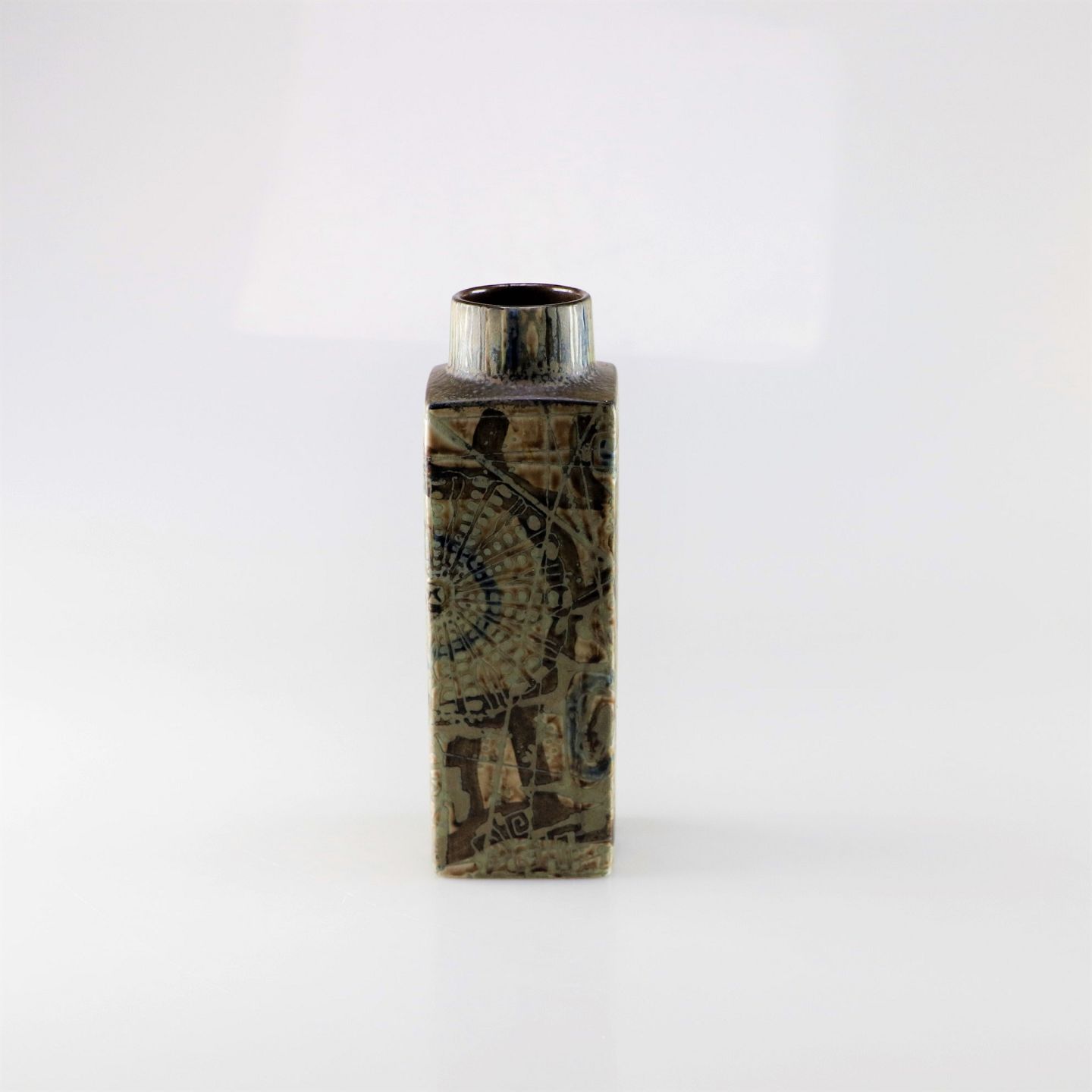 Kvadratisk vase med et kunstværk af brunlige farver